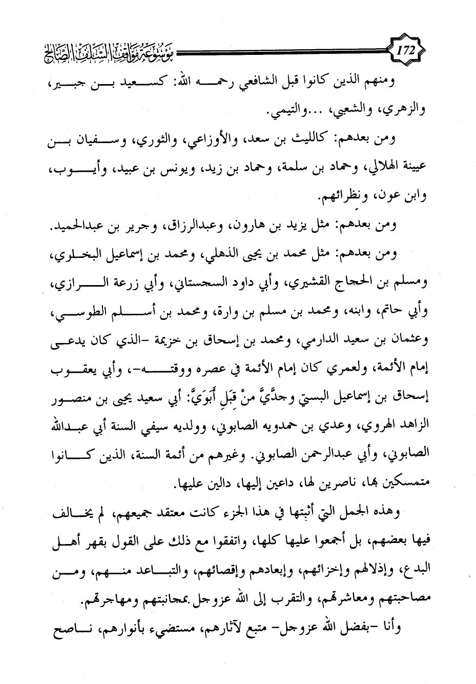 ومن بعدهم: مثل محمد بن يحيى الذهلي، ومحمد بن إسماعيل البخاري، ومسلم بن الحجاج القشيري، وأبي داود السجستاني، وأبي زرعة الرازي، وأبي حاتم، وابنه، ومحمد بن مسلم بن وارة، ومحمد بن أسلم الطوسي، وعثمان بن سعيد الدارمي، ومحمد بن إسحاق بن خزيمة -الذي كان يدعى إمام الأئمة، ولعمري كان إمام الأئمة في عصره ووقته-، وأبي يعقوب إسحاق بن إسماعيل البستي وجدَّيَّ منْ قِبَلِ أَبَوَيَّ: أبي سعيد يحيى بن منصور الزاهد الهروي، وعدي بن حمدويه الصابوني، وولديه سيفي السنة أبي عبد الله الصابوني، وأبي عبد الرحمن الصابوني. وغيرهم من أئمة السنة، الذين كانوا متمسكين بها، ناصرين لها، داعين إليها، دالين عليها.