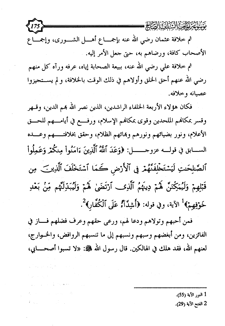 فكان هؤلاء الأربعة الخلفاء الراشدين، الذين نصر الله بهم الدين، وقهر وقسر بمكانهم الملحدين وقوى بمكانهم الإسلام، ورفع في أيامهم للحق الأعلام، ونور بضيائهم ونورهم وبهائهم الظلام، وحقق بخلافتهم وعده السابق في قوله عزوجل: {وَعَدَ اللَّهُ الَّذِينَ آَمَنُوا مِنْكُمْ وَعَمِلُوا الصَّالِحَاتِ لَيَسْتَخْلِفَنَّهُمْ فِي الْأَرْضِ كَمَا اسْتَخْلَفَ الَّذِينَ مِنْ قَبْلِهِمْ وَلَيُمَكِّنَنَّ لَهُمْ دِينَهُمُ الَّذِي ارْتَضَى لَهُمْ وَلَيُبَدِّلَنَّهُمْ مِنْ بَعْدِ خَوْفِهِمْ} (¬1) الآية، وفي قوله: {أشداء عَلَى الْكُفَّارِ} (¬2).