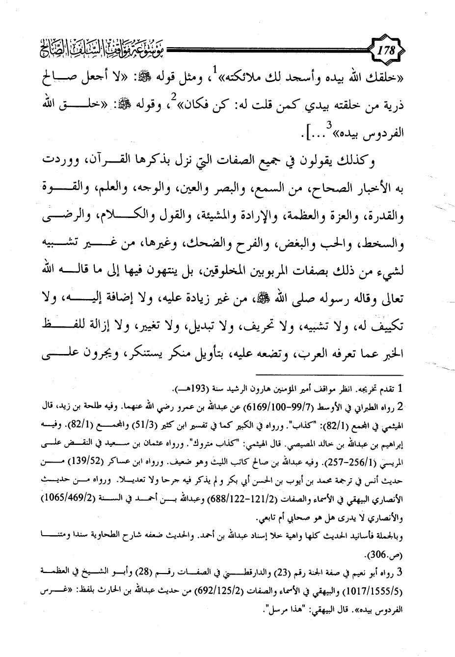 «خلقك الله بيده وأسجد لك ملائكته» (¬1)، ومثل قوله - صلى الله عليه وسلم -: «لا أجعل صالح ذرية من خلقته بيدي كمن قلت له: كن فكان» (¬2)،