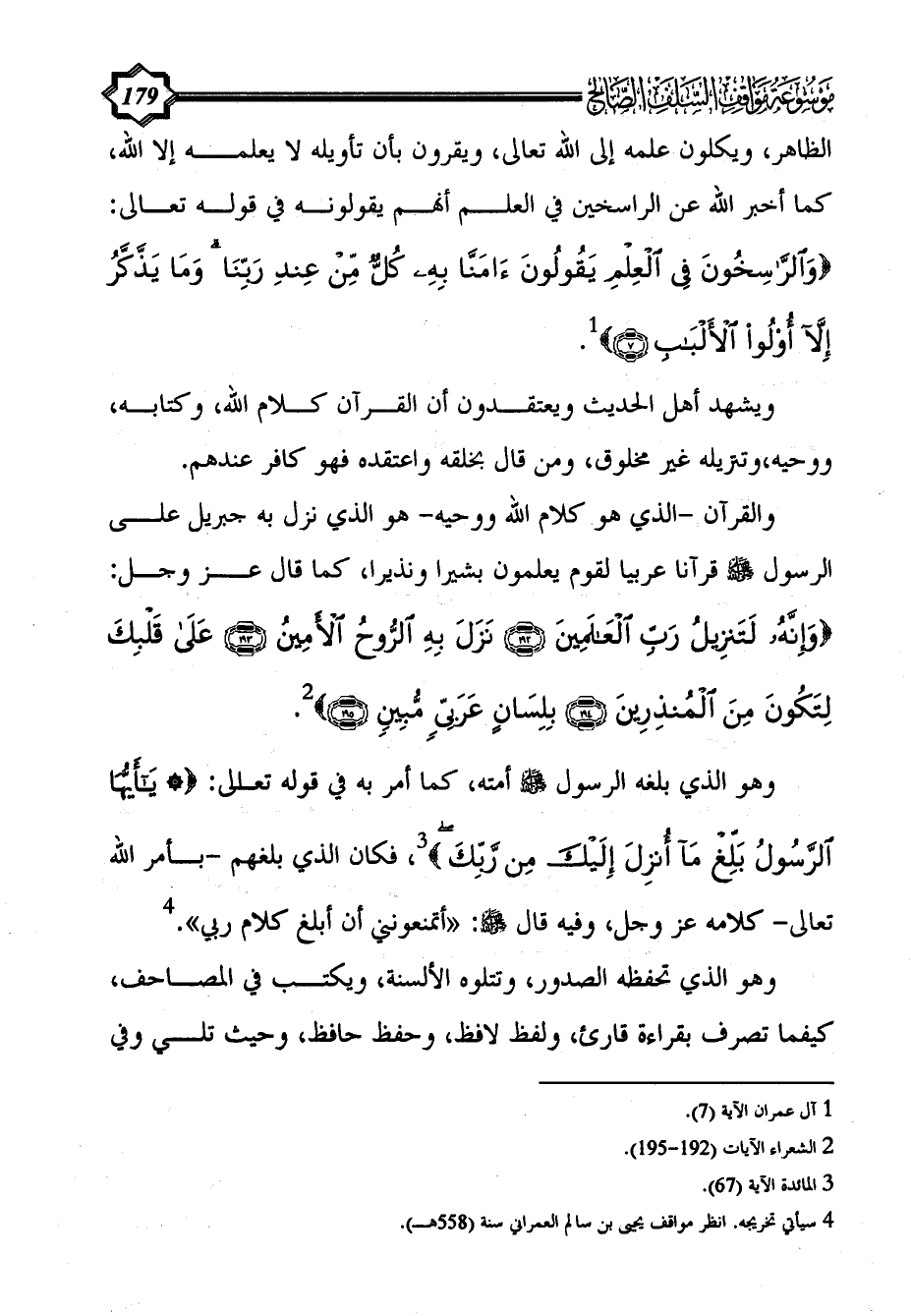 وهو الذي بلغه الرسول - صلى الله عليه وسلم - أمته، كما أمر به في قوله تعالى: {* يَا أَيُّهَا الرَّسُولُ بَلِّغْ مَا أُنْزِلَ إِلَيْكَ مِنْ رَبِّكَ} (¬3)، فكان الذي بلغهم -بأمر الله تعالى- كلامه عز وجل، وفيه قال - صلى الله عليه وسلم -: «أتمنعونني أن أبلغ كلام ربي». (¬4)