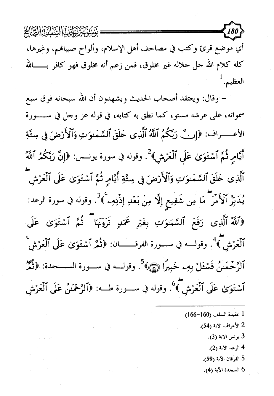 - وقال: ويعتقد أصحاب الحديث ويشهدون أن الله سبحانه فوق سبع سمواته، على عرشه مستو، كما نطق به كتابه، في قوله عز وجل في سورة الأعراف: {إِن رَبَّكُمُ اللَّهُ الَّذِي خَلَقَ السَّمَاوَاتِ وَالْأَرْضَ فِي سِتَّةِ أَيَّامٍ ثُمَّ اسْتَوَى عَلَى الْعَرْشِ} (¬2). وقوله في سورة يونس: {إِنَّ رَبَّكُمُ اللَّهُ الَّذِي خَلَقَ السَّمَاوَاتِ وَالْأَرْضَ فِي سِتَّةِ أَيَّامٍ ثُمَّ اسْتَوَى عَلَى الْعَرْشِ يُدَبِّرُ الْأَمْرَ مَا مِنْ شَفِيعٍ إِلَّا مِنْ بَعْدِ إِذْنِهِ} (¬3). وقوله في سورة الرعد: {اللَّهُ الَّذِي رَفَعَ السَّمَاوَاتِ بِغَيْرِ عَمَدٍ تَرَوْنَهَا ثُمَّ اسْتَوَى عَلَى الْعَرْشِ} (¬4). وقوله في سورة الفرقان: {ثُمَّ اسْتَوَى عَلَى الْعَرْشِ الرَّحْمَنُ فَاسْأَلْ بِهِ خَبِيرًا (59)} (¬5). وقوله في سورة السجدة: {الرحمن اسْتَوَى عَلَى الْعَرْشِ} (¬6). وقوله في سورة طه: {الرَّحْمَنُ عَلَى الْعَرْشِ
