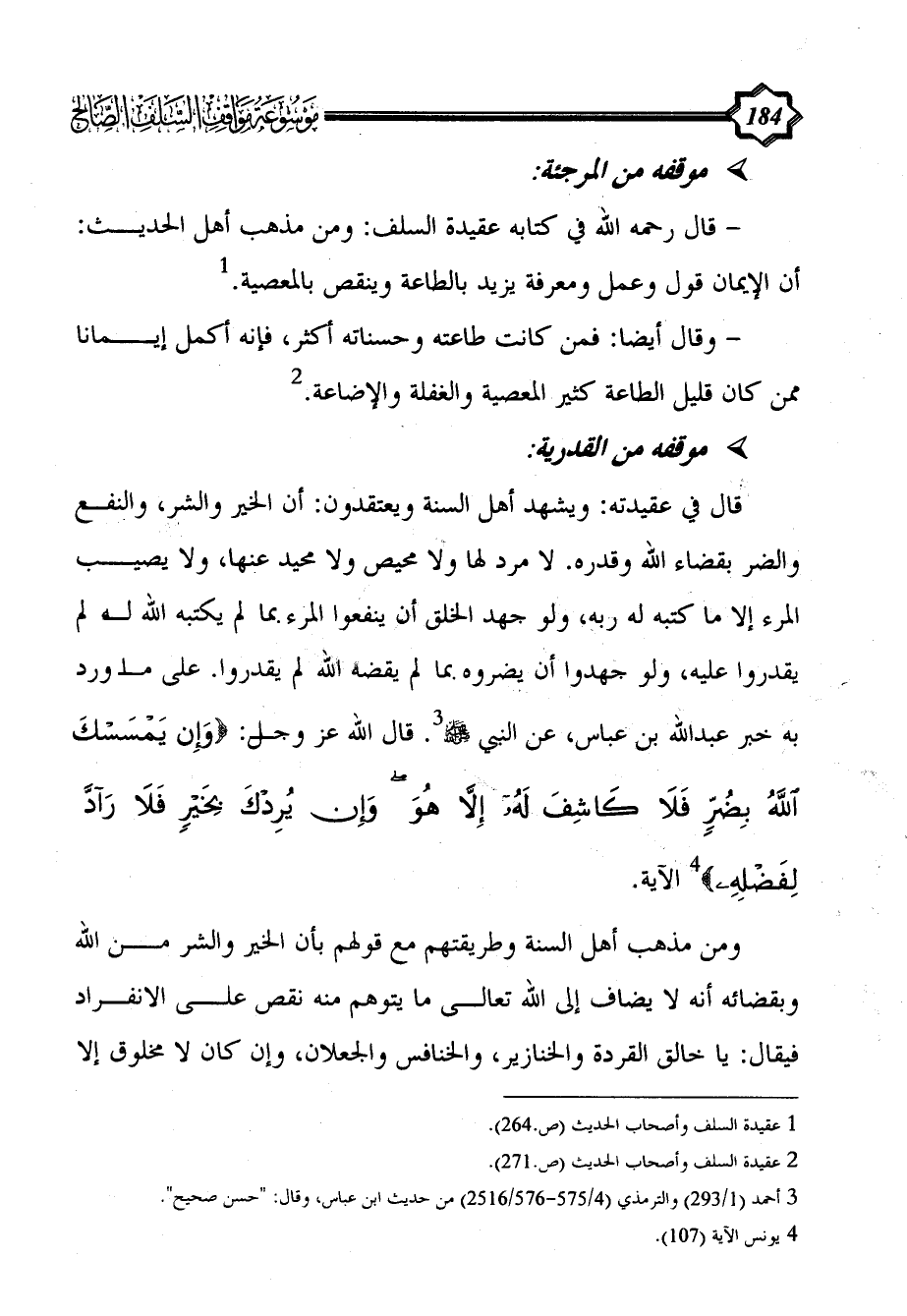- قال رحمه الله في كتابه عقيدة السلف: ومن مذهب أهل الحديث: أن الإيمان قول وعمل ومعرفة يزيد بالطاعة وينقص بالمعصية. (¬1)