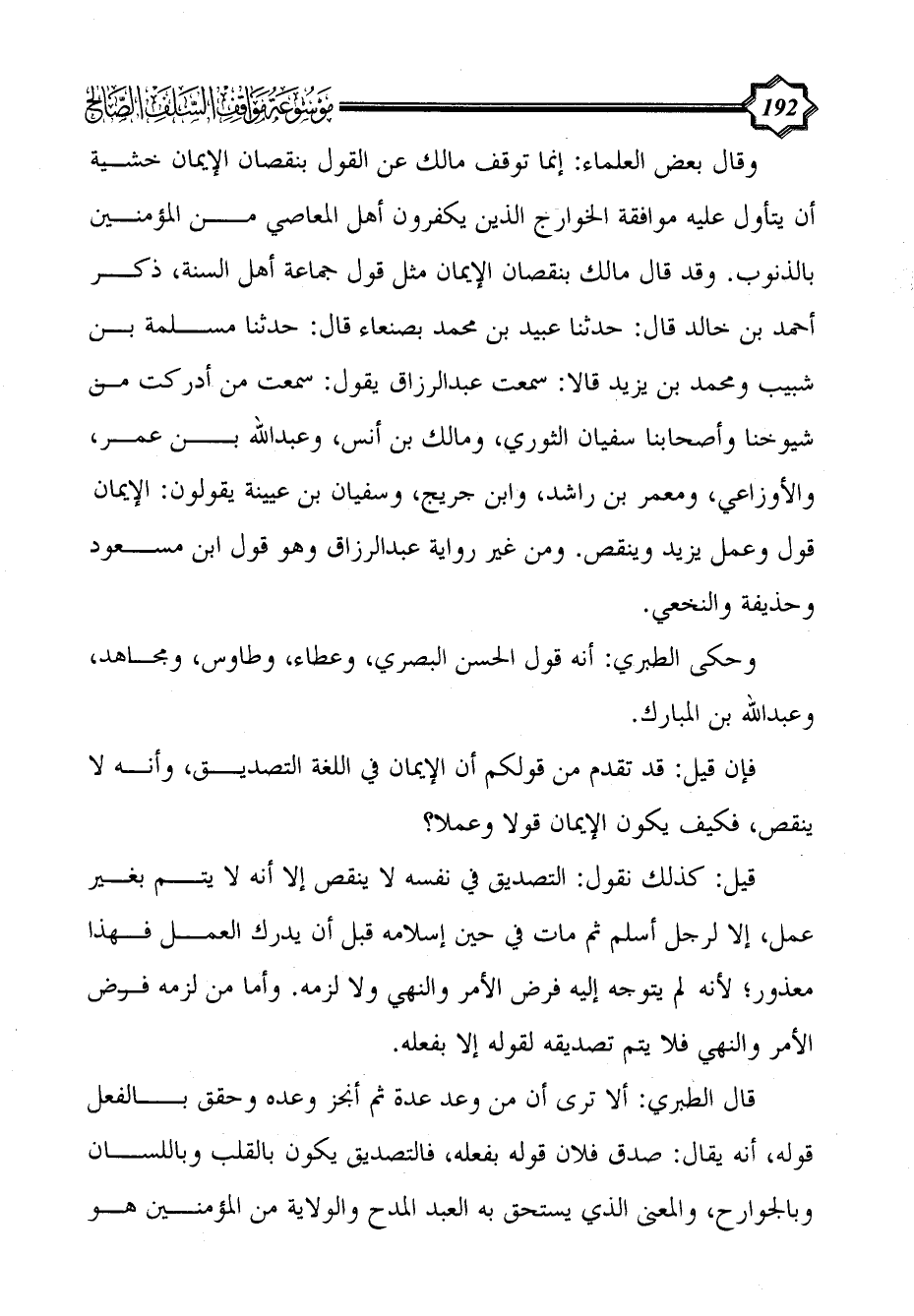 وقال بعض العلماء: إنما توقف مالك عن القول بنقصان الإيمان خشية أن يتأول عليه موافقة الخوارج الذين يكفرون أهل المعاصي من المؤمنين بالذنوب. وقد قال مالك بنقصان الإيمان مثل قول جماعة أهل السنة، ذكر أحمد بن خالد قال: حدثنا عبيد بن محمد بصنعاء قال: حدثنا مسلمة بن شبيب ومحمد بن يزيد قالا: سمعت عبد الرزاق يقول: سمعت من أدركت من شيوخنا وأصحابنا سفيان الثوري، ومالك بن أنس، وعبد الله بن عمر، والأوزاعي، ومعمر بن راشد، وابن جريج، وسفيان بن عيينة يقولون: الإيمان قول وعمل يزيد وينقص. ومن غير رواية عبد الرزاق وهو قول ابن مسعود وحذيفة والنخعي.