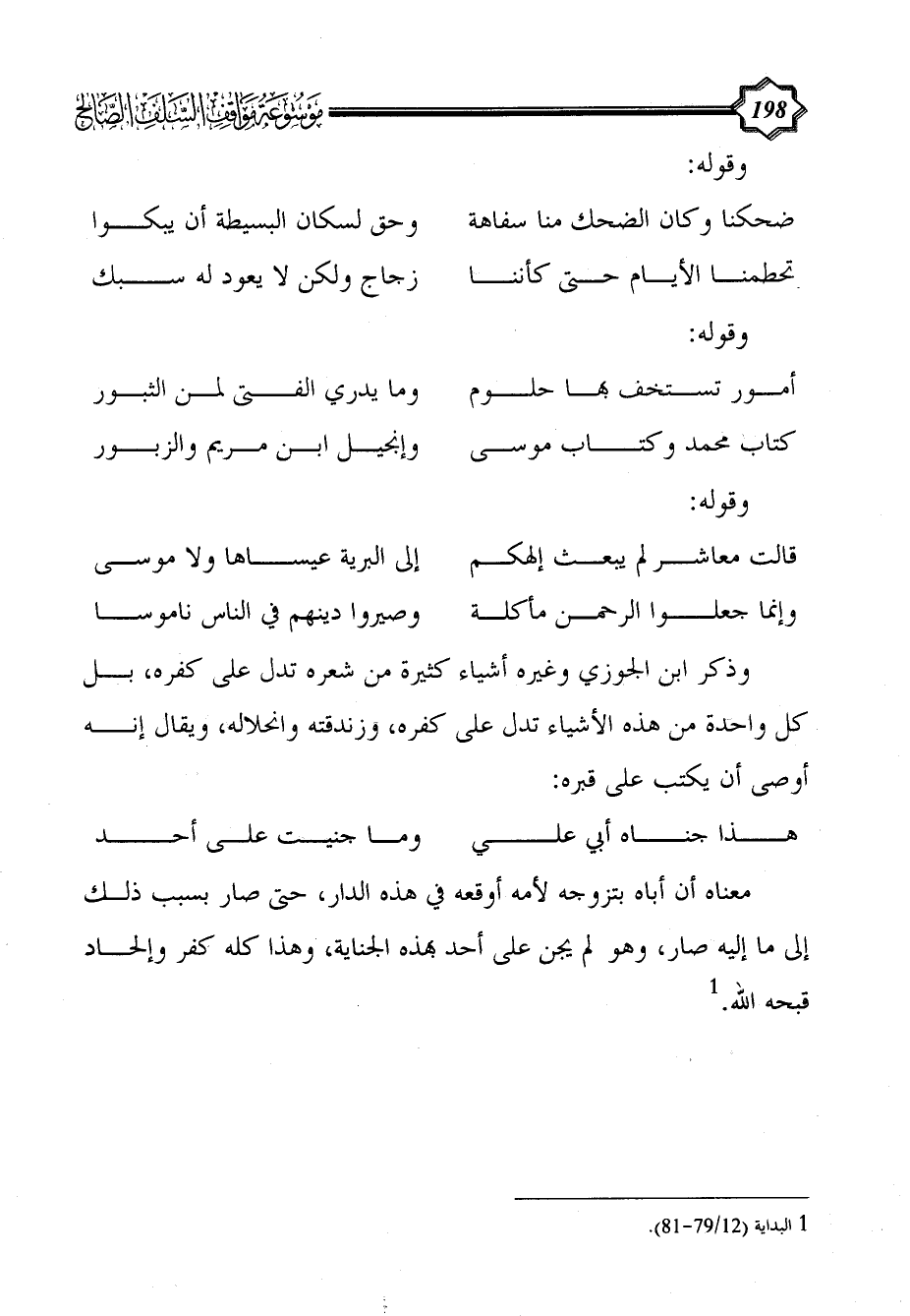 وذكر ابن الجوزي وغيره أشياء كثيرة من شعره تدل على كفره، بل كل واحدة من هذه الأشياء تدل على كفره، وزندقته وانحلاله، ويقال إنه أوصى أن يكتب على قبره: