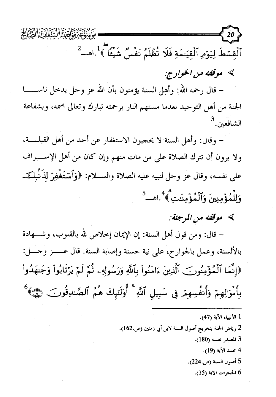- قال: ومن قول أهل السنة: إن الإيمان إخلاص لله بالقلوب، وشهادة بالألسنة، وعمل بالجوارح، على نية حسنة وإصابة السنة. قال عز وجل: {إِنَّمَا الْمُؤْمِنُونَ الَّذِينَ آَمَنُوا بِاللَّهِ وَرَسُولِهِ ثُمَّ لَمْ يَرْتَابُوا وَجَاهَدُوا بِأَمْوَالِهِمْ وَأَنْفُسِهِمْ فِي سَبِيلِ اللَّهِ أُولَئِكَ هُمُ الصَّادِقُونَ (15)} (¬6)