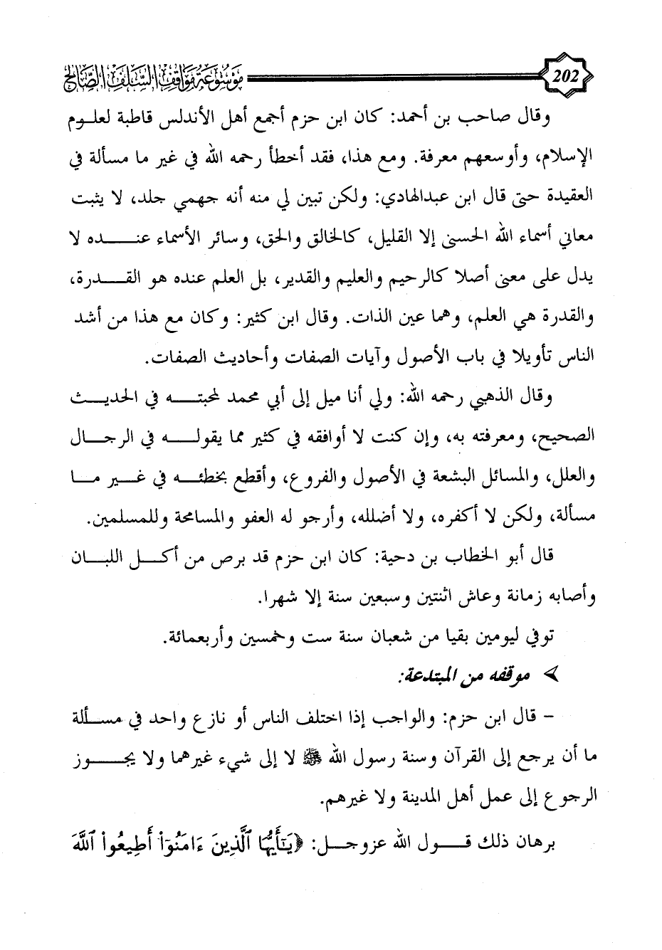 - قال ابن حزم: والواجب إذا اختلف الناس أو نازع واحد في مسألة ما أن يرجع إلى القرآن وسنة رسول الله - صلى الله عليه وسلم - لا إلى شيء غيرهما ولا يجوز الرجوع إلى عمل أهل المدينة ولا غيرهم.