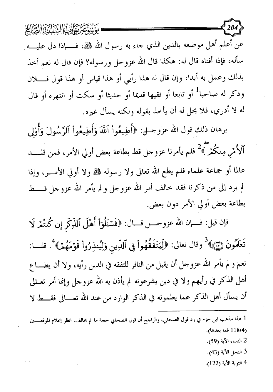 فإن قيل: فإن الله عزوجل قال: {فسألوا أَهْلَ الذِّكْرِ إِنْ كُنْتُمْ لَا تَعْلَمُونَ (43)} (¬3) وقال تعالى: {لِيَتَفَقَّهُوا فِي الدِّينِ وَلِيُنْذِرُوا قَوْمَهُمْ} (¬4). قلنا: نعم ولم يأمر الله عزوجل أن يقبل من النافر للتفقه في الدين رأيه، ولا أن يطاع أهل الذكر في رأيهم ولا في دين يشرعونه لم يأذن به الله عزوجل وإنما أمر تعالى أن يسأل أهل الذكر عما يعلمونه في الذكر الوارد من عند الله تعالى فقط لا
