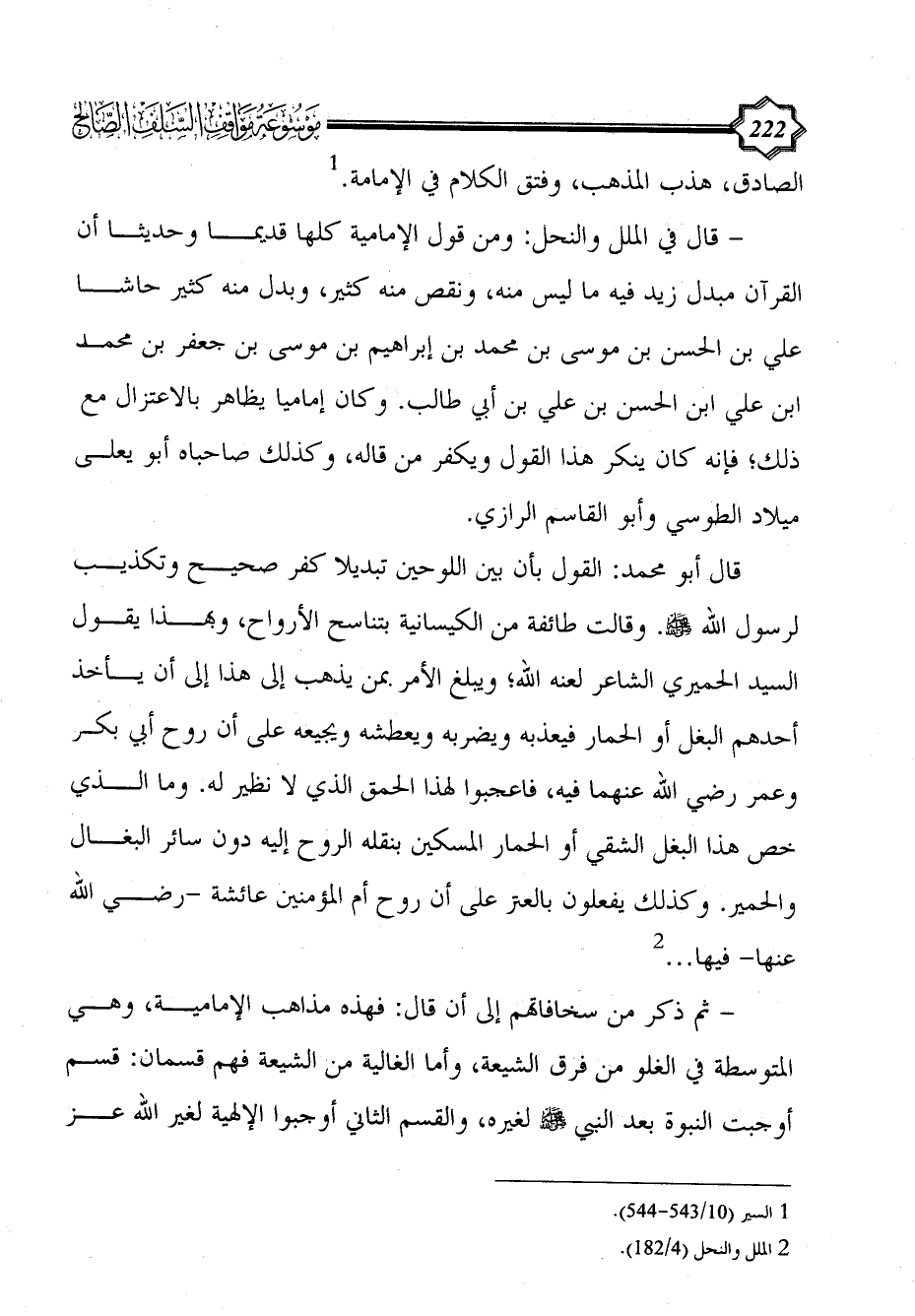 - ثم ذكر من سخافاتهم إلى أن قال: فهذه مذاهب الإمامية، وهي المتوسطة في الغلو من فرق الشيعة، وأما الغالية من الشيعة فهم قسمان: قسم أوجبت النبوة بعد النبي - صلى الله عليه وسلم - لغيره، والقسم الثاني أوجبوا الإلهية لغير الله عز