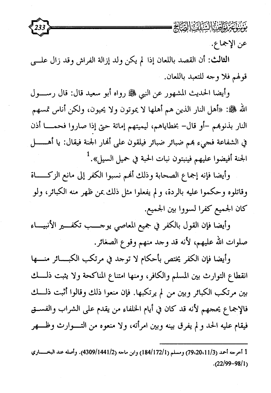 وأيضا فإنه إجماع الصحابة وذلك أنهم نسبوا الكفر إلى مانع الزكاة وقاتلوه وحكموا عليه بالردة، ولم يفعلوا مثل ذلك بمن ظهر منه الكبائر، ولو كان الجميع كفرا لسووا بين الجميع.