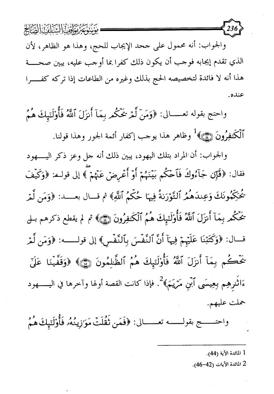 والجواب: أن المراد بتلك اليهود، يبين ذلك أنه جل وعز ذكر اليهود فقال: {فإن جَاءُوكَ فَاحْكُمْ بَيْنَهُمْ أَوْ أَعْرِضْ عَنْهُمْ} إلى قوله: {وَكَيْفَ يُحَكِّمُونَكَ وَعِنْدَهُمُ التَّوْرَاةُ فِيهَا حُكْمُ اللَّهِ} ثم قال بعد: {وَمَنْ لَمْ يَحْكُمْ بِمَا أَنْزَلَ اللَّهُ فَأُولَئِكَ هُمُ الْكَافِرُونَ (44)} ثم لم يقطع ذكرهم بل قال: {وَكَتَبْنَا عَلَيْهِمْ فِيهَا أَنَّ النَّفْسَ بِالنَّفْسِ} إلى قوله: {وَمَنْ لَمْ يَحْكُمْ بِمَا أَنْزَلَ اللَّهُ فَأُولَئِكَ هُمُ الظَّالِمُونَ (45)} {وَقَفَّيْنَا عَلَى آَثَارِهِمْ بِعِيسَى ابْنِ مَرْيَمَ} (¬2). فإذا كانت القصة أولها وآخرها في اليهود حملت عليهم.