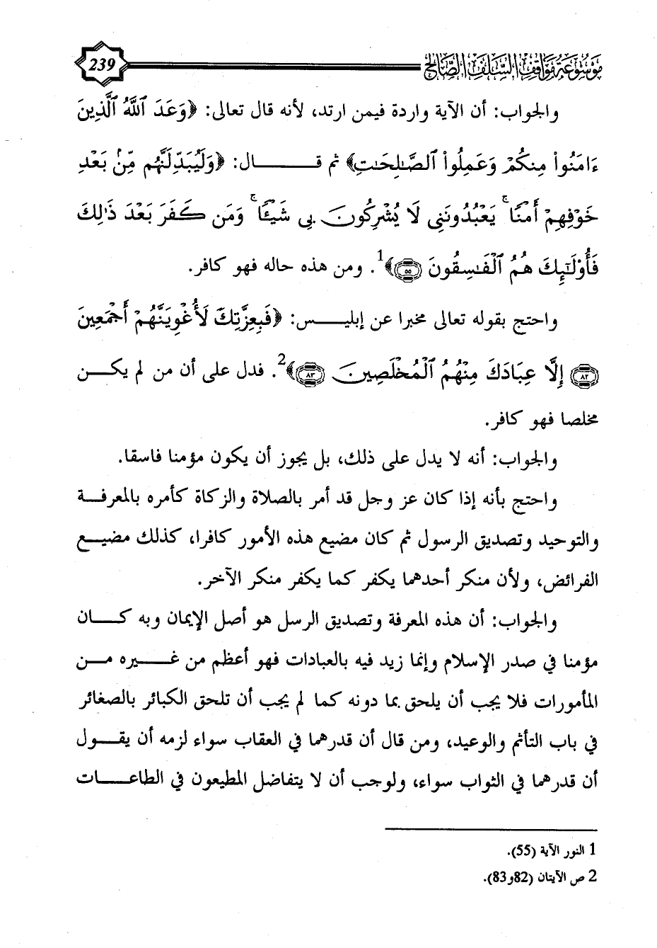 واحتج بقوله تعالى مخبرا عن إبليس: {فبعزتك لَأُغْوِيَنَّهُمْ أَجْمَعِينَ (82) إِلَّا عِبَادَكَ مِنْهُمُ الْمُخْلَصِينَ (83)} (¬2). فدل على أن من لم يكن مخلصا فهو كافر.
