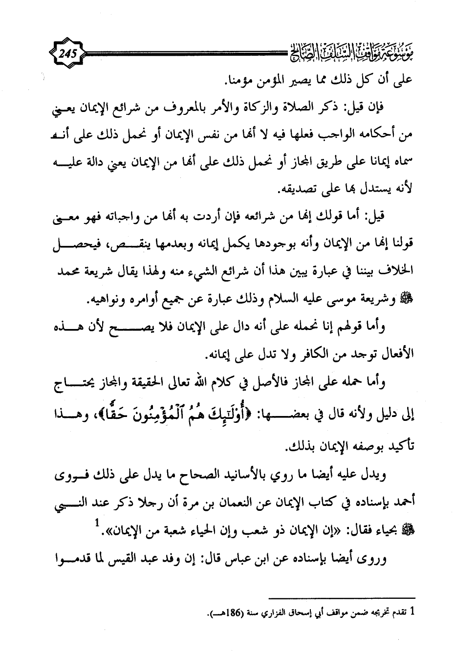 ويدل عليه أيضا ما روي بالأسانيد الصحاح ما يدل على ذلك فروى أحمد بإسناده في كتاب الإيمان عن النعمان بن مرة أن رجلا ذكر عند النبي - صلى الله عليه وسلم - بحياء فقال: «إن الإيمان ذو شعب وإن الحياء شعبة من الإيمان». (¬1)