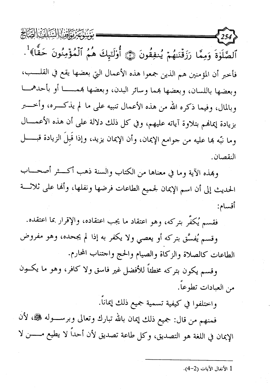 وبهذه الآية وما في معناها من الكتاب والسنة ذهب أكثر أصحاب الحديث إلى أن اسم الإيمان لجميع الطاعات فرضها ونفلها، وأنها على ثلاثة أقسام:
