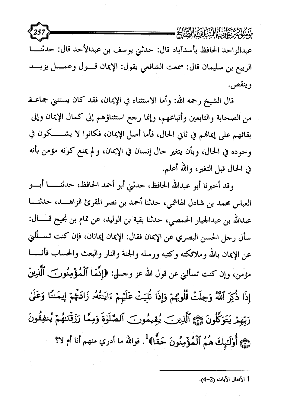 عبد الواحد الحافظ بأسدآباد قال: حدثني يوسف بن عبد الأحد قال: حدثنا الربيع بن سليمان قال: سمعت الشافعي يقول: الإيمان قول وعمل يزيد وينقص.
