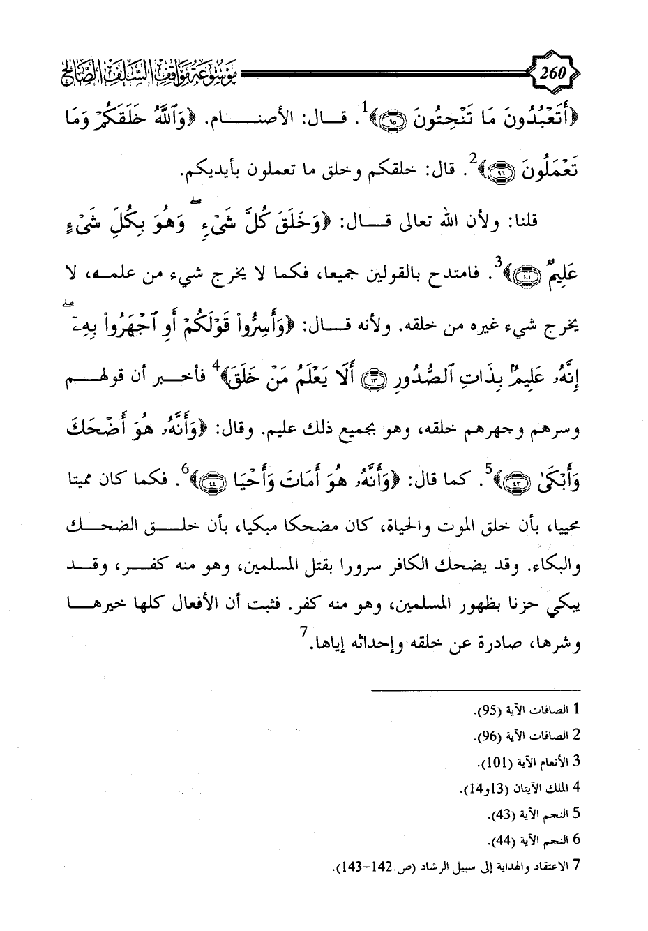 قلنا: ولأن الله تعالى قال: {وَخَلَقَ كُلَّ شَيْءٍ وَهُوَ بِكُلِّ شَيْءٍ عَلِيمٌ (101)} (¬3). فامتدح بالقولين جميعا، فكما لا يخرج شيء من علمه، لا يخرج شيء غيره من خلقه. ولأنه قال: {وَأَسِرُّوا قَوْلَكُمْ أَوِ اجْهَرُوا بِهِ إِنَّهُ عَلِيمٌ بِذَاتِ الصُّدُورِ (13) أَلَا يَعْلَمُ مَنْ خَلَقَ} (¬4) فأخبر أن قولهم وسرهم وجهرهم خلقه، وهو بجميع ذلك عليم. وقال: {وَأَنَّهُ هُوَ أَضْحَكَ وَأَبْكَى (43)} (¬5). كما قال: {وَأَنَّهُ هُوَ أَمَاتَ وَأَحْيَا (44)} (¬6). فكما كان مميتا محييا، بأن خلق الموت والحياة، كان مضحكا مبكيا، بأن خلق الضحك والبكاء. وقد يضحك الكافر سرورا بقتل المسلمين، وهو منه كفر، وقد يبكي حزنا بظهور المسلمين، وهو منه كفر. فثبت أن الأفعال كلها خيرها وشرها، صادرة عن خلقه وإحداثه إياها. (¬7)