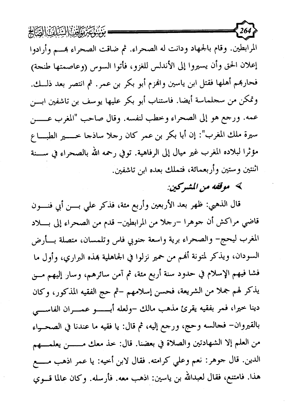 قال الذهبي: ظهر بعد الأربعين وأربع مئة، فذكر علي بن أبي فنون قاضي مراكش أن جوهرا -رجلا من المرابطين- قدم من الصحراء إلى بلاد المغرب ليحج- والصحراء برية واسعة جنوبي فاس وتلمسان، متصلة بأرض السودان، ويذكر لمتونة أنهم من حمير نزلوا في الجاهلية بهذه البراري، وأول ما فشا فيهم الإسلام في حدود سنة أربع مئة، ثم آمن سائرهم، وسار إليهم من يذكر لهم جملا من الشريعة، فحسن إسلامهم -ثم حج الفقيه المذكور، وكان دينا خيرا، فمر بفقيه يقرئ مذهب مالك -ولعله أبو عمران الفاسي بالقيروان- فجالسه وحج، ورجع إليه، ثم قال: يا فقيه ما عندنا في الصحراء من العلم إلا الشهادتين والصلاة في بعضنا. قال: خذ معك من يعلمهم الدين. قال جوهر: نعم وعلي كرامته. فقال لابن أخيه: يا عمر اذهب مع هذا. فامتنع، فقال لعبد الله بن ياسين: اذهب معه. فأرسله. وكان عالما قوي