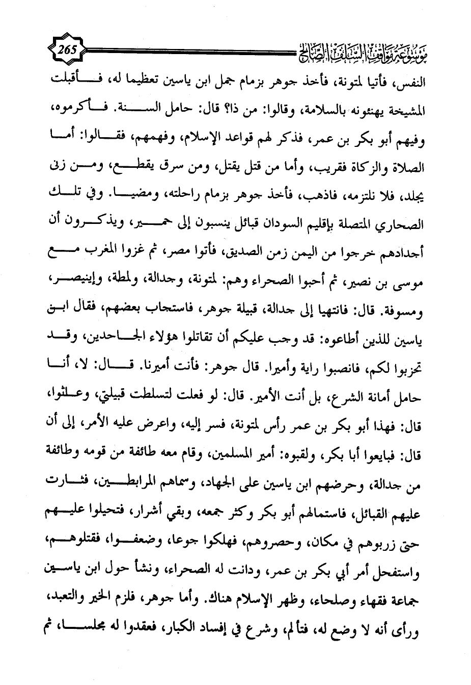 النفس، فأتيا لمتونة، فأخذ جوهر بزمام جمل ابن ياسين تعظيما له، فأقبلت المشيخة يهنئونه بالسلامة، وقالوا: من ذا؟ قال: حامل السنة. فأكرموه، وفيهم أبو بكر بن عمر، فذكر لهم قواعد الإسلام، وفهمهم، فقالوا: أما الصلاة والزكاة فقريب، وأما من قتل يقتل، ومن سرق يقطع، ومن زنى يجلد، فلا نلتزمه، فاذهب، فأخذ جوهر بزمام راحلته، ومضيا. وفي تلك الصحاري المتصلة بإقليم السودان قبائل ينسبون إلى حمير، ويذكرون أن أجدادهم خرجوا من اليمن زمن الصديق، فأتوا مصر، ثم غزوا المغرب مع موسى بن نصير، ثم أحبوا الصحراء وهم: لمتونة، وجدالة، ولمطة، وإينيصر، ومسوفة. قال: فانتهيا إلى جدالة، قبيلة جوهر، فاستجاب بعضهم، فقال ابن ياسين للذين أطاعوه: قد وجب عليكم أن تقاتلوا هؤلاء الجاحدين، وقد تحزبوا لكم، فانصبوا راية وأميرا. قال جوهر: فأنت أميرنا. قال: لا، أنا حامل أمانة الشرع، بل أنت الأمير.