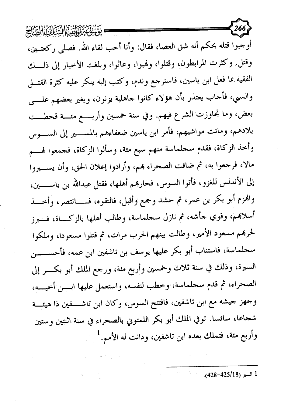أوجبوا قتله بحكم أنه شق العصا، فقال: وأنا أحب لقاء الله. فصلى ركعتين، وقتل. وكثرت المرابطون، وقتلوا، ونهبوا، وعاثوا، وبلغت الأخبار إلى ذلك الفقيه بما فعل ابن ياسين، فاسترجع وندم، وكتب إليه ينكر عليه كثرة القتل والسبي، فأجاب يعتذر بأن هؤلاء كانوا جاهلية يزنون، ويغير بعضهم على بعض، وما تجاوزت الشرع فيهم.