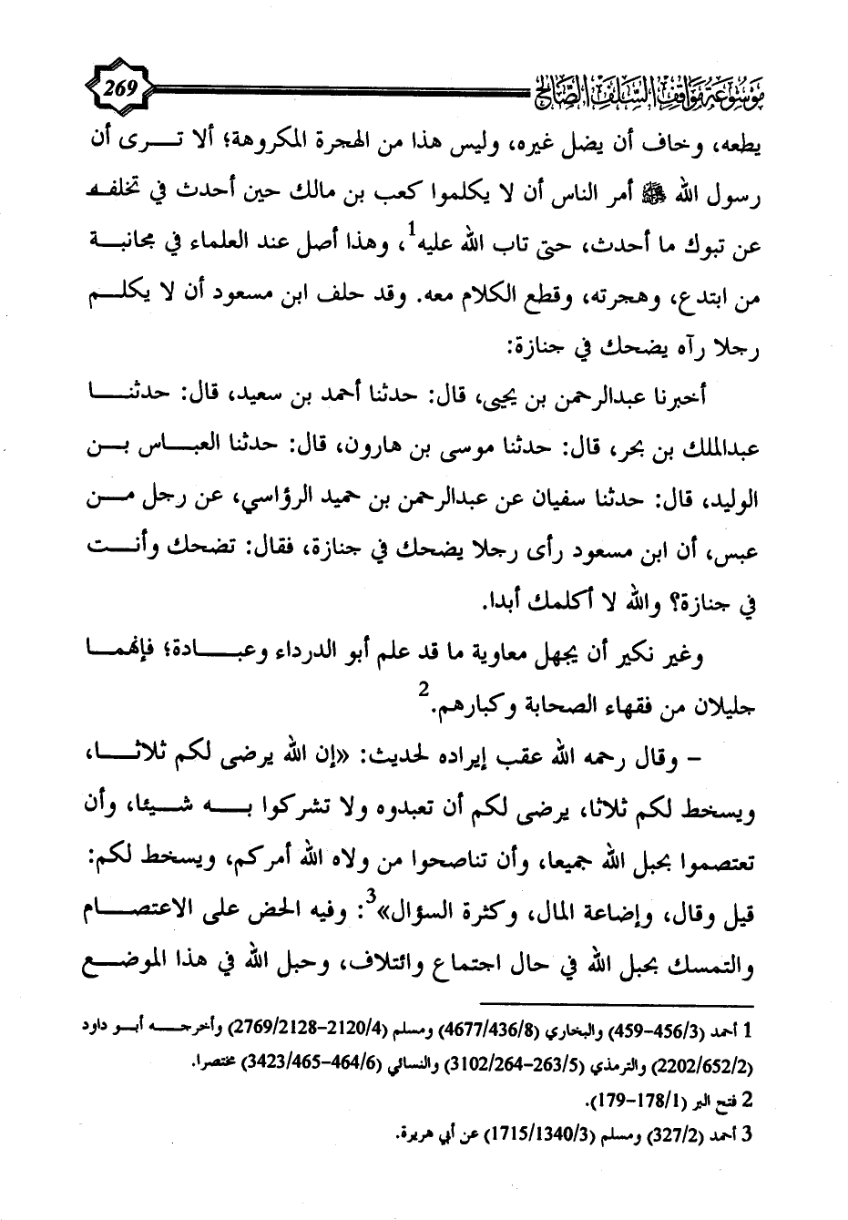 - وقال رحمه الله عقب إيراده لحديث: «إن الله يرضى لكم ثلاثا، ويسخط لكم ثلاثا، يرضى لكم أن تعبدوه ولا تشركوا به شيئا، وأن تعتصموا بحبل الله جميعا، وأن تناصحوا من ولاه الله أمركم، ويسخط لكم: قيل وقال، وإضاعة المال، وكثرة السؤال» (¬3): وفيه الحض على الاعتصام والتمسك بحبل الله في حال اجتماع وائتلاف، وحبل الله في هذا الموضع