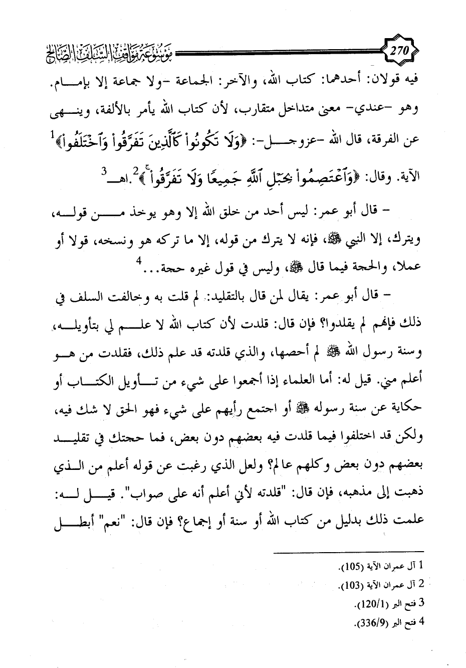- قال أبو عمر: يقال لمن قال بالتقليد: لم قلت به وخالفت السلف في ذلك فإنهم لم يقلدوا؟ فإن قال: قلدت لأن كتاب الله لا علم لي بتأويله، وسنة رسول الله - صلى الله عليه وسلم - لم أحصها، والذي قلدته قد علم ذلك، فقلدت من هو أعلم مني. قيل له: أما العلماء إذا أجمعوا على شيء من تأويل الكتاب أو حكاية عن سنة رسوله - صلى الله عليه وسلم - أو اجتمع رأيهم على شيء فهو الحق لا شك فيه، ولكن قد اختلفوا فيما قلدت فيه بعضهم دون بعض، فما حجتك في تقليد بعضهم دون بعض وكلهم عالم؟ ولعل الذي رغبت عن قوله أعلم من الذي ذهبت إلى مذهبه، فإن قال: "قلدته لأني أعلم أنه على صواب". قيل له: علمت ذلك بدليل من كتاب الله أو سنة أو إجماع؟ فإن قال: "نعم" أبطل
