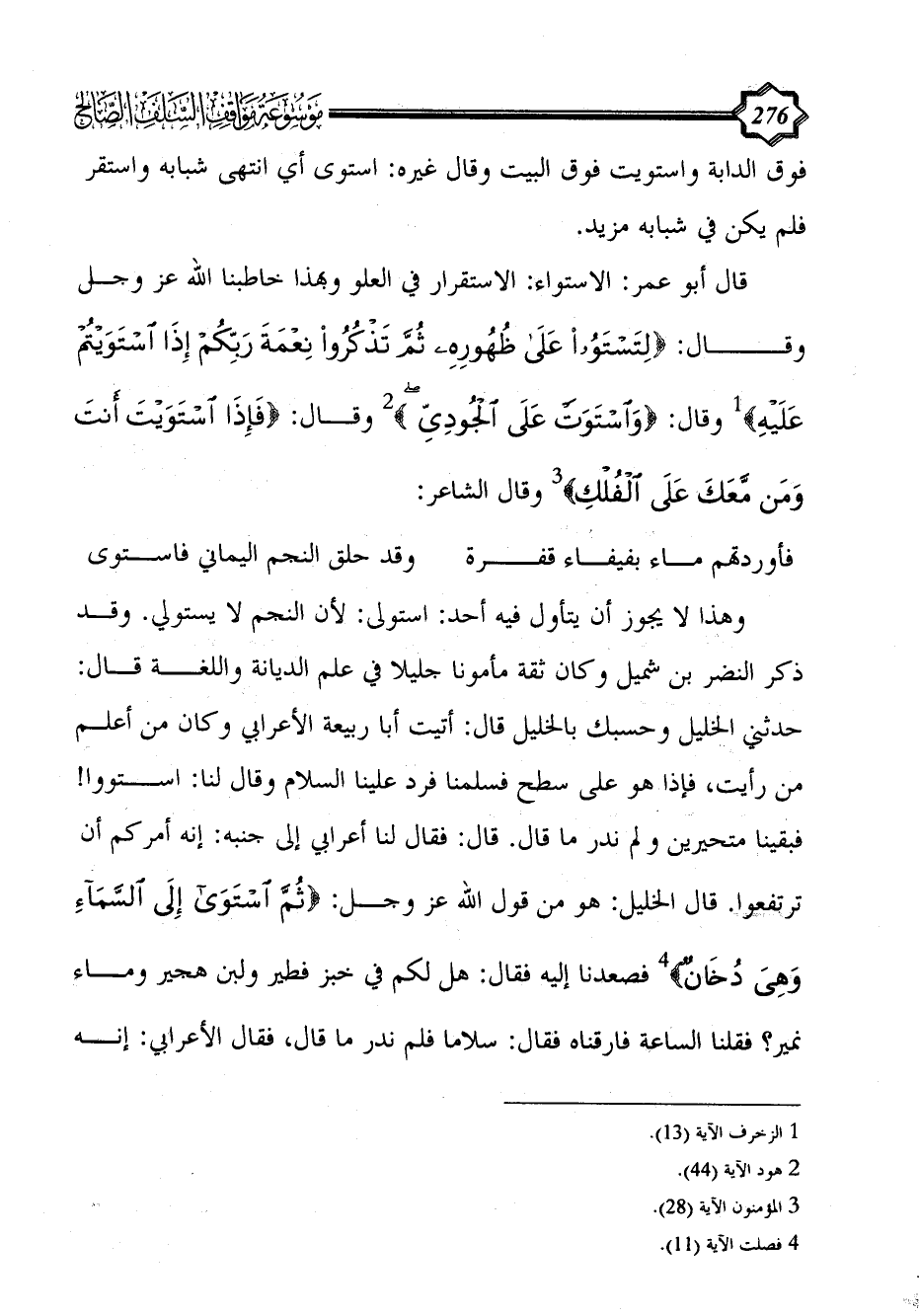 وهذا لا يجوز أن يتأول فيه أحد: استولى: لأن النجم لا يستولي. وقد ذكر النضر بن شميل وكان ثقة مأمونا جليلا في علم الديانة واللغة قال: حدثني الخليل وحسبك بالخليل قال: أتيت أبا ربيعة الأعرابي وكان من أعلم من رأيت، فإذا هو على سطح فسلمنا فرد علينا السلام وقال لنا: استووا! فبقينا متحيرين ولم ندر ما قال. قال: فقال لنا أعرابي إلى جنبه: إنه أمركم أن ترتفعوا. قال الخليل: هو من قول الله عز وجل: {ثُمَّ اسْتَوَى إِلَى السَّمَاءِ وَهِيَ دُخَانٌ} (¬4) فصعدنا إليه فقال: هل لكم في خبز فطير ولبن هجير وماء نمير؟ فقلنا الساعة فارقناه فقال: سلاما فلم ندر ما قال، فقال الأعرابي: إنه