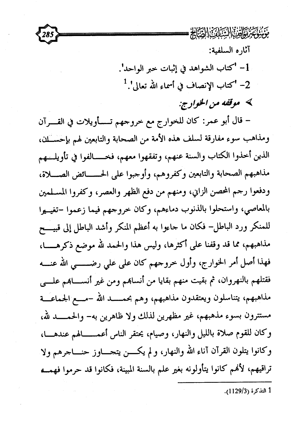 - قال أبو عمر: كان للخوارج مع خروجهم تأويلات في القرآن ومذاهب سوء مفارقة لسلف هذه الأمة من الصحابة والتابعين لهم بإحسان، الذين أخذوا الكتاب والسنة عنهم، وتفقهوا معهم، فخالفوا في تأويلهم مذاهبهم الصحابة والتابعين وكفروهم، وأوجبوا على الحائض الصلاة، ودفعوا رجم المحصن الزاني، ومنهم من دفع الظهر والعصر، وكفروا المسلمين بالمعاصي، واستحلوا بالذنوب دماءهم، وكان خروجهم فيما زعموا -تغييرا للمنكر ورد الباطل- فكان ما جاءوا به أعظم المنكر وأشد الباطل إلى قبيح مذاهبهم، مما قد وقفنا على أكثرها، وليس هذا والحمد لله موضع ذكرها، فهذا أصل أمر الخوارج، وأول خروجهم كان على علي رضي الله عنه فقتلهم بالنهروان، ثم بقيت منهم بقايا من أنسابهم ومن غير أنسابهم على مذاهبهم، يتناسلون ويعتقدون مذاهبهم، وهم بحمد الله -مع الجماعة مستترون بسوء مذهبهم، غير مظهرين لذلك ولا ظاهرين به- والحمد لله، وكان للقوم صلاة بالليل والنهار، وصيام، يحتقر الناس أعمالهم عندها، وكانوا يتلون القرآن آناء الله والنهار، ولم يكن يتجاوز حناجرهم ولا تراقيهم، لأنهم كانوا يتأولونه بغير علم بالسنة المبينة، فكانوا قد حرموا فهمه