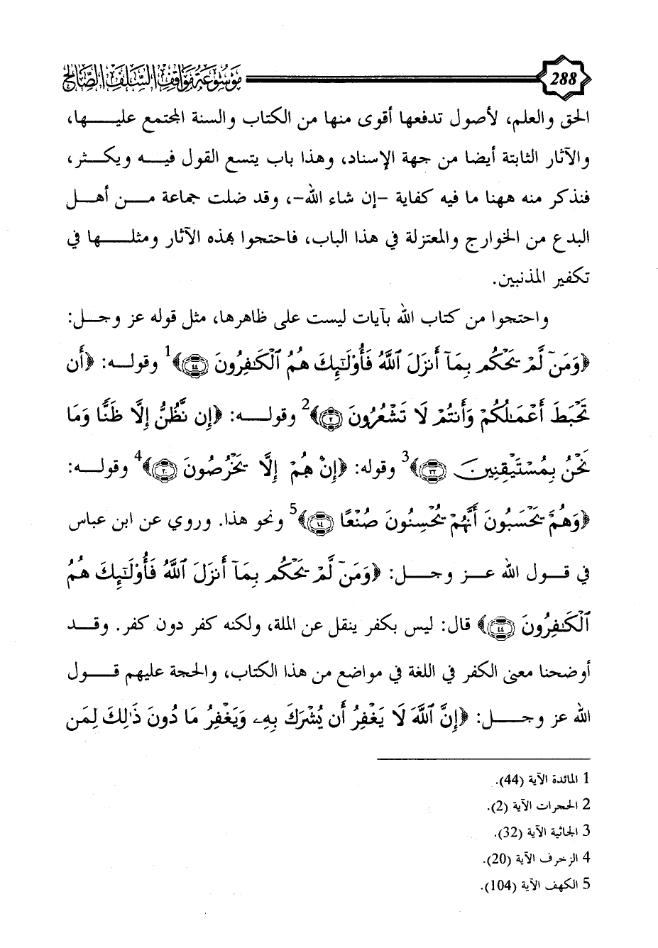 واحتجوا من كتاب الله بآيات ليست على ظاهرها، مثل قوله عز وجل: {ومن لَمْ يَحْكُمْ بِمَا أَنْزَلَ اللَّهُ فَأُولَئِكَ هُمُ الْكَافِرُونَ (44)} (¬1) وقوله: {أَنْ تَحْبَطَ أَعْمَالُكُمْ وَأَنْتُمْ لَا تَشْعُرُونَ (2)} (¬2) وقوله: {إِنْ نَظُنُّ إِلَّا ظَنًّا وَمَا نَحْنُ بِمُسْتَيْقِنِينَ (32)} (¬3) وقوله: {إن هم إِلَّا يَخْرُصُونَ (20)} (¬4) وقوله: {وهم يَحْسَبُونَ أَنَّهُمْ يُحْسِنُونَ صُنْعًا (104)} (¬5) ونحو هذا. وروي عن ابن عباس في قول الله عز وجل: {ومن لَمْ يَحْكُمْ بِمَا أَنْزَلَ اللَّهُ فَأُولَئِكَ هُمُ الْكَافِرُونَ (44)} قال: ليس بكفر ينقل عن الملة، ولكنه كفر دون كفر. وقد أوضحنا معنى الكفر في اللغة في مواضع من هذا الكتاب، والحجة عليهم قول الله عز وجل: {إِنَّ اللَّهَ لَا يَغْفِرُ أَنْ يُشْرَكَ بِهِ وَيَغْفِرُ مَا دُونَ ذَلِكَ لِمَنْ