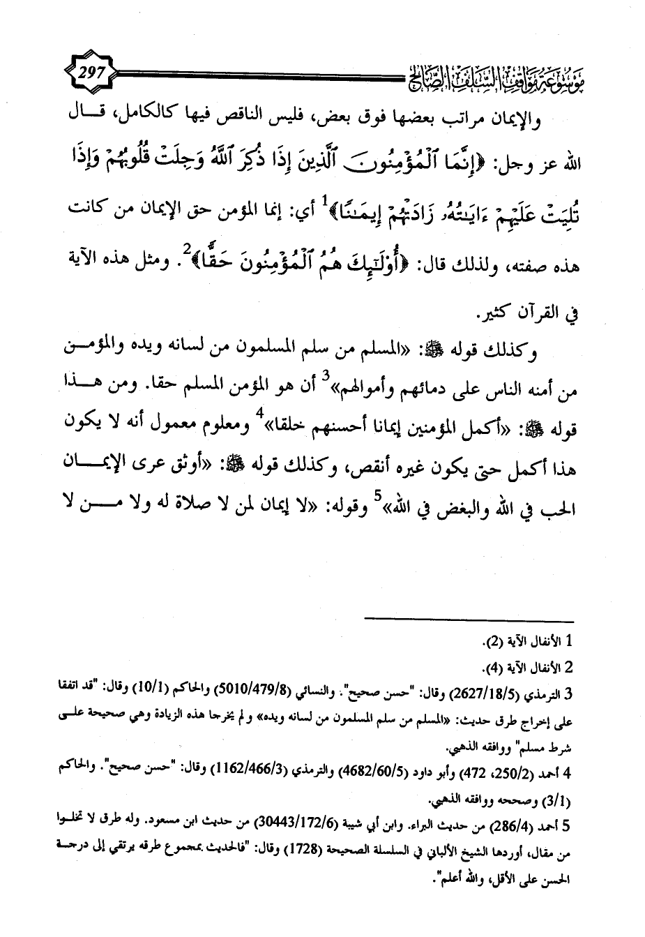 والإيمان مراتب بعضها فوق بعض، فليس الناقص فيها كالكامل، قال الله عز وجل: {إِنَّمَا الْمُؤْمِنُونَ الَّذِينَ إِذَا ذُكِرَ اللَّهُ وَجِلَتْ قُلُوبُهُمْ وَإِذَا تُلِيَتْ عَلَيْهِمْ آَيَاتُهُ زَادَتْهُمْ إِيمَانًا} (¬1) أي: إنما المؤمن حق الإيمان من كانت هذه صفته، ولذلك قال: {أُولَئِكَ هُمُ الْمُؤْمِنُونَ حَقًّا} (¬2). ومثل هذه الآية في القرآن كثير.