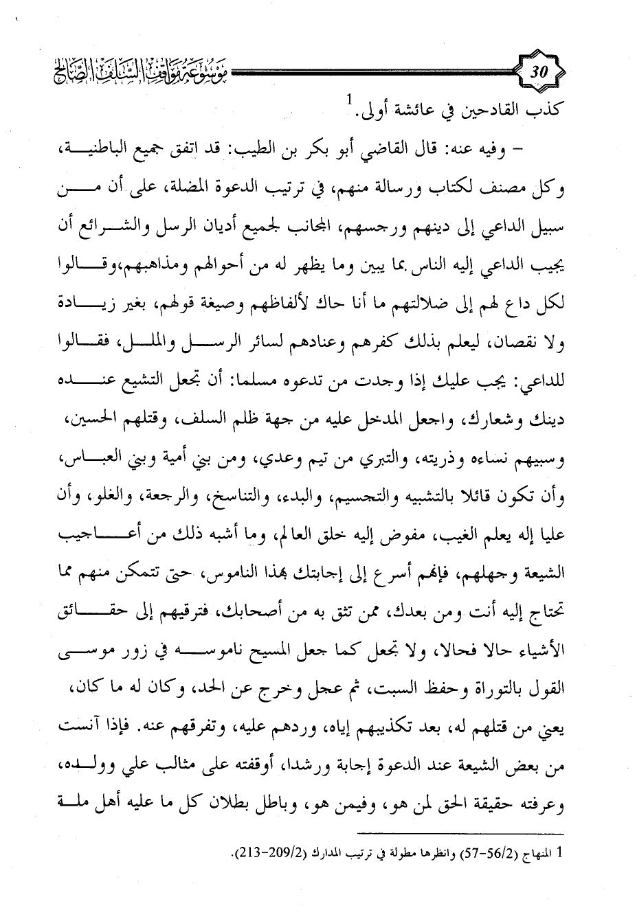 - وفيه عنه: قال القاضي أبو بكر بن الطيب: قد اتفق جميع الباطنية، وكل مصنف لكتاب ورسالة منهم، في ترتيب الدعوة المضلة، على أن من سبيل الداعي إلى دينهم ورجسهم، المجانب لجميع أديان الرسل والشرائع أن يجيب الداعي إليه الناس بما يبين وما يظهر له من أحوالهم ومذاهبهم، وقالوا لكل داع لهم إلى ضلالتهم ما أنا حاك لألفاظهم وصيغة قولهم، بغير زيادة ولا نقصان، ليعلم بذلك كفرهم وعنادهم لسائر الرسل والملل، فقالوا للداعي: يجب عليك إذا وجدت من تدعوه مسلما: أن تجعل التشيع عنده دينك وشعارك، واجعل المدخل عليه من جهة ظلم السلف، وقتلهم الحسين، وسبيهم نساءه وذريته، والتبري من تيم وعدي، ومن بني أمية وبني العباس، وأن تكون قائلا بالتشبيه والتجسيم، والبدء، والتناسخ، والرجعة، والغلو، وأن عليا إله يعلم الغيب، مفوض إليه خلق العالم، وما أشبه ذلك من أعاجيب الشيعة وجهلهم، فإنهم أسرع إلى إجابتك بهذا الناموس، حتى تتمكن منهم مما تحتاج إليه أنت ومن بعدك، ممن تثق به من أصحابك، فترقيهم إلى حقائق الأشياء حالا فحالا، ولا تجعل كما جعل المسيح ناموسه في زور موسى القول بالتوراة وحفظ السبت، ثم عجل وخرج عن الحد، وكان له ما كان، يعني من قتلهم له، بعد تكذيبهم إياه، وردهم عليه، وتفرقهم عنه. فإذا آنست من بعض الشيعة عند الدعوة إجابة ورشدا، أوقفته على مثالب علي وولده، وعرفته حقيقة الحق لمن هو، وفيمن هو، وباطل بطلان كل ما عليه أهل ملة