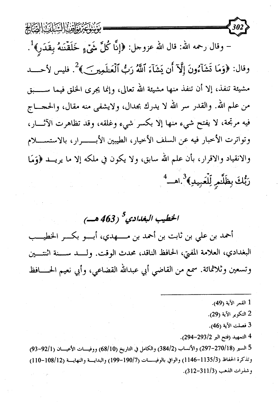 - وقال رحمه الله: قال الله عزوجل: {إِنَّا كُلَّ شَيْءٍ خَلَقْنَاهُ بِقَدَرٍ} (¬1). وقال: {وَمَا تَشَاءُونَ إِلَّا أَنْ يَشَاءَ اللَّهُ رَبُّ الْعَالَمِينَ} (¬2). فليس لأحد مشيئة تنفذ، إلا أن تنفذ منها مشيئة الله تعالى، وإنما يجرى الخلق فيما سبق من علم الله. والقدر سر الله لا يدرك بجدال، ولايشفى منه مقال، والحجاج فيه مرتجة، لا يفتح شيء منها إلا بكسر شيء وغلقه، وقد تظاهرت الآثار، وتواترت الأخبار فيه عن السلف الأخيار، الطيبين الأبرار، بالاستسلام والانقياد والاقرار، بأن علم الله سابق، ولا يكون في ملكه إلا ما يريد {وَمَا رَبُّكَ بِظَلَّامٍ لِلْعَبِيدِ} (¬3).اهـ (¬4)
