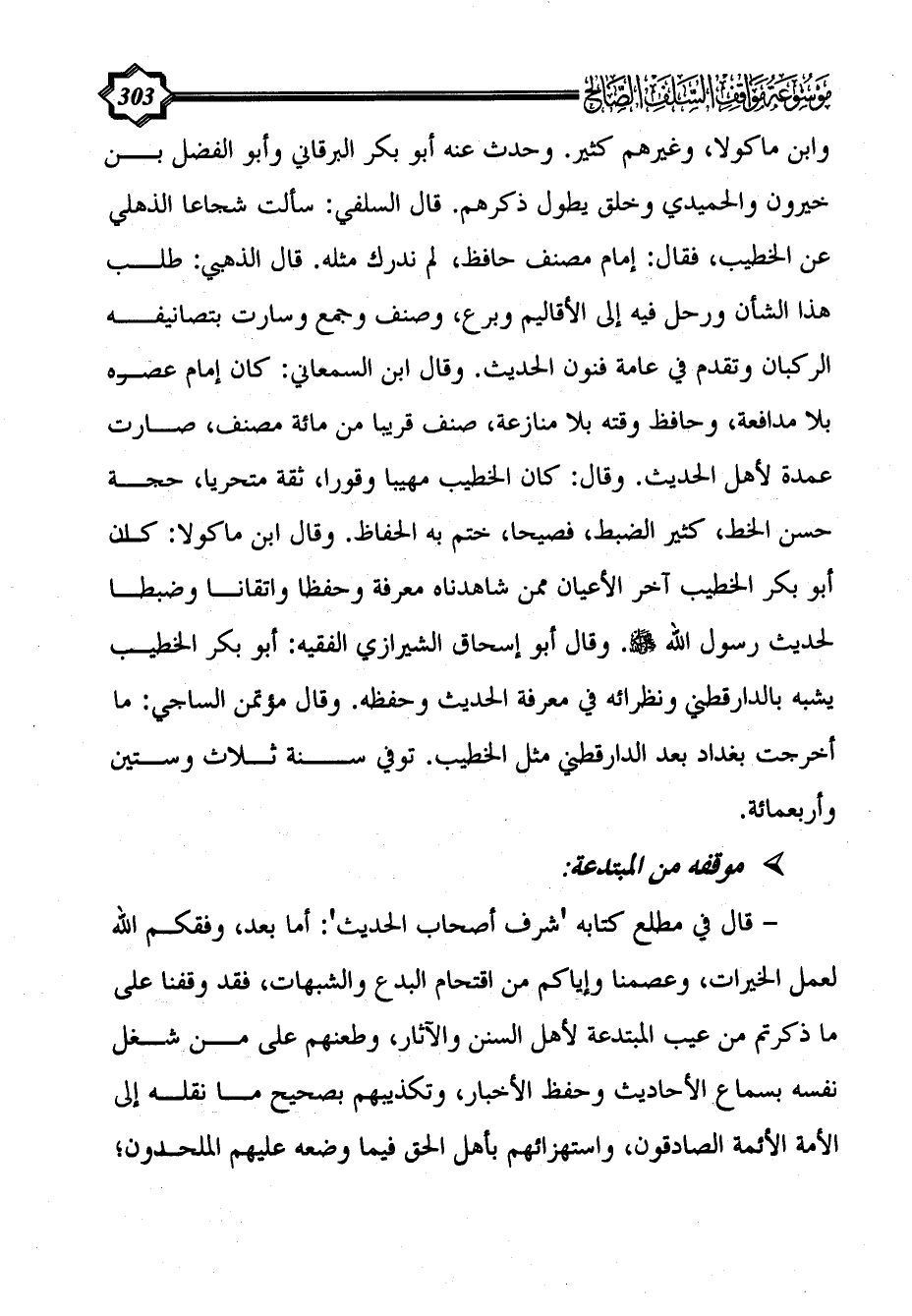 - قال في مطلع كتابه 'شرف أصحاب الحديث': أما بعد، وفقكم الله لعمل الخيرات، وعصمنا وإياكم من اقتحام البدع والشبهات، فقد وقفنا على ما ذكرتم من عيب المبتدعة لأهل السنن والآثار، وطعنهم على من شغل نفسه بسماع الأحاديث وحفظ الأخبار، وتكذيبهم بصحيح ما نقله إلى الأمة الأئمة الصادقون، واستهزائهم بأهل الحق فيما وضعه عليهم الملحدون؛