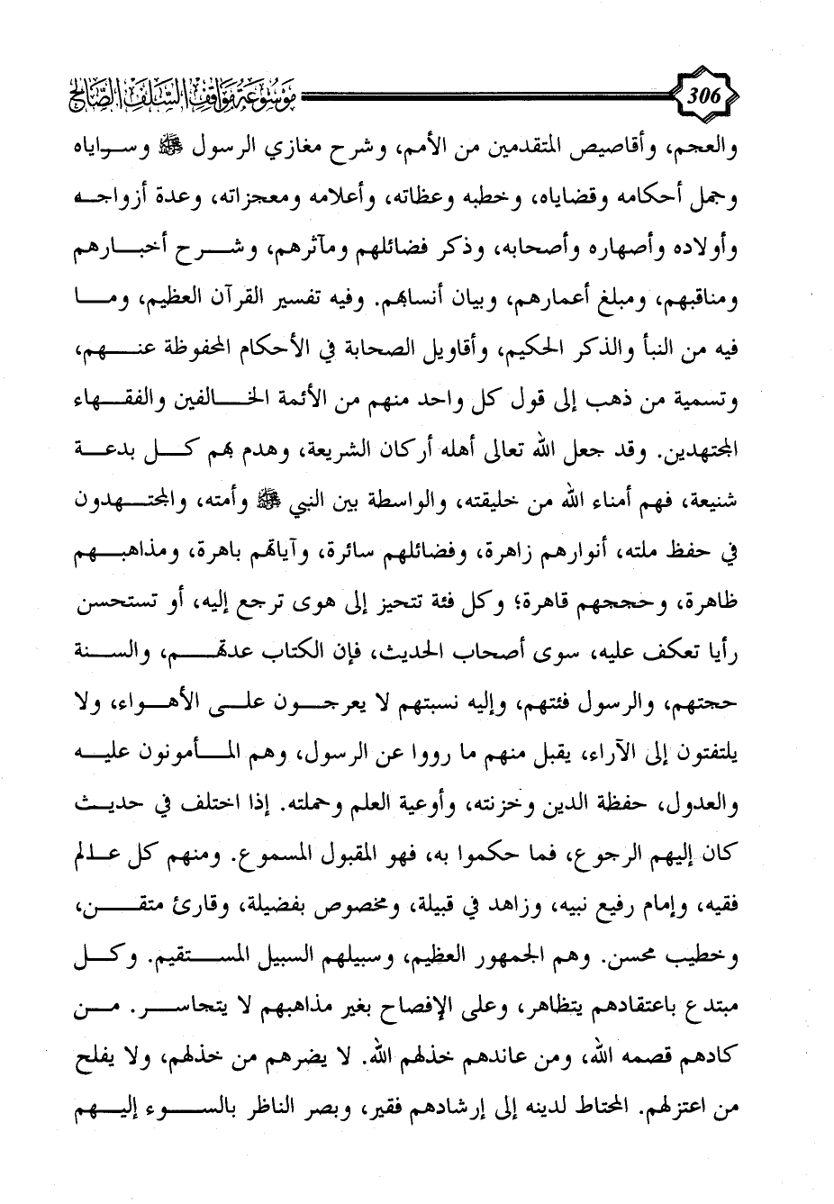والعجم، وأقاصيص المتقدمين من الأمم، وشرح مغازي الرسول - صلى الله عليه وسلم - وسراياه وجمل أحكامه وقضاياه، وخطبه وعظاته، وأعلامه ومعجزاته، وعدة أزواجه وأولاده وأصهاره وأصحابه، وذكر فضائلهم ومآثرهم، وشرح أخبارهم ومناقبهم، ومبلغ أعمارهم، وبيان أنسابهم. وفيه تفسير القرآن العظيم، وما فيه من النبأ والذكر الحكيم، وأقاويل الصحابة في الأحكام المحفوظة عنهم، وتسمية من ذهب إلى قول كل واحد منهم من الأئمة الخالفين والفقهاء المجتهدين. وقد جعل الله تعالى أهله أركان الشريعة، وهدم بهم كل بدعة شنيعة، فهم أمناء الله من خليقته، والواسطة بين النبي - صلى الله عليه وسلم - وأمته، والمجتهدون في حفظ ملته، أنوارهم زاهرة، وفضائلهم سائرة، وآياتهم باهرة، ومذاهبهم ظاهرة، وحججهم قاهرة؛ وكل فئة تتحيز إلى هوى ترجع إليه، أو تستحسن رأيا تعكف عليه، سوى أصحاب الحديث، فإن الكتاب عدتهم، والسنة حجتهم، والرسول فئتهم، وإليه نسبتهم لا يعرجون على الأهواء، ولا يلتفتون إلى الآراء، يقبل منهم ما رووا عن الرسول، وهم المأمونون عليه والعدول، حفظة الدين وخزنته، وأوعية العلم وحملته.
