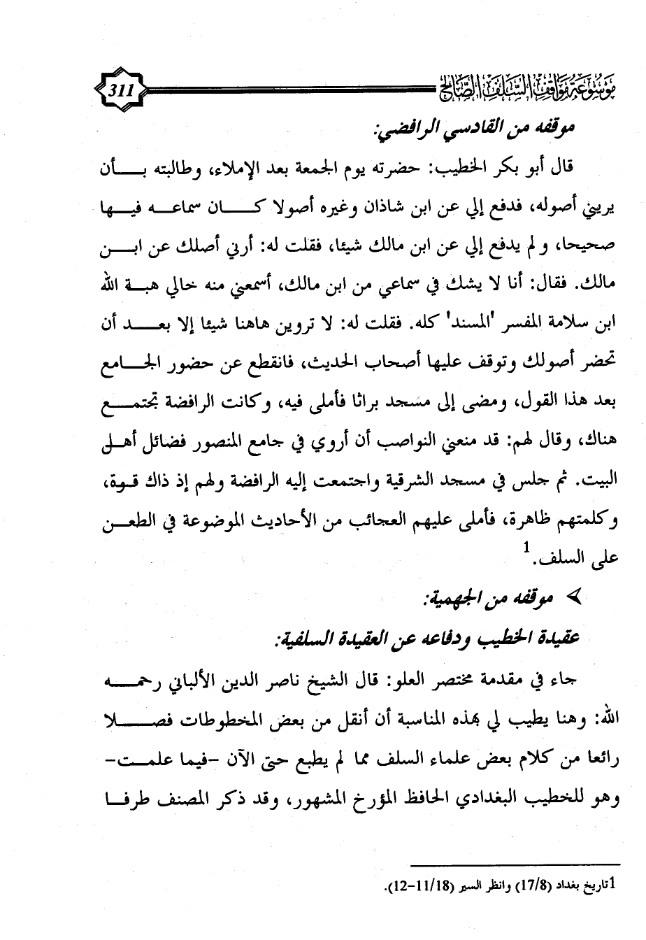 جاء في مقدمة مختصر العلو: قال الشيخ ناصر الدين الألباني رحمه الله: وهنا يطيب لي بهذه المناسبة أن أنقل من بعض المخطوطات فصلا رائعا من كلام بعض علماء السلف مما لم يطبع حتى الآن -فيما علمت- وهو للخطيب البغدادي الحافظ المؤرخ المشهور، وقد ذكر المصنف طرفا