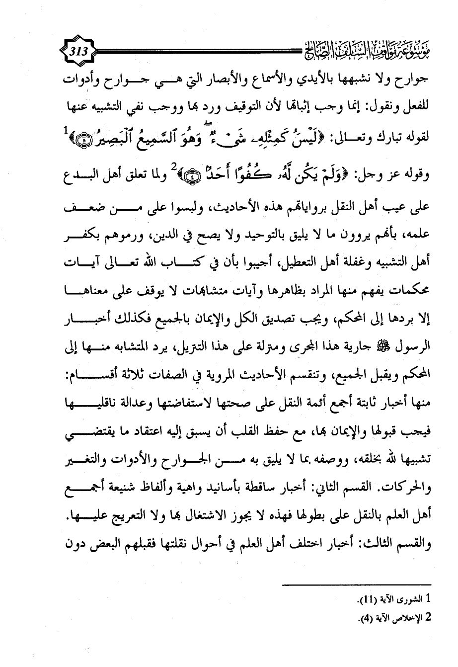 ولما تعلق أهل البدع على عيب أهل النقل برواياتهم هذه الأحاديث، ولبسوا على من ضعف علمه، بأنهم يروون ما لا يليق بالتوحيد ولا يصح في الدين، ورموهم بكفر أهل التشبيه وغفلة أهل التعطيل، أجيبوا بأن في كتاب الله تعالى آيات محكمات يفهم منها المراد بظاهرها وآيات متشابهات لا يوقف على معناها إلا بردها إلى المحكم، ويجب تصديق الكل والإيمان بالجميع فكذلك أخبار الرسول - صلى الله عليه وسلم - جارية هذا المجرى ومنزلة على هذا التنزيل، يرد المتشابه منها إلى المحكم ويقبل الجميع، وتنقسم الأحاديث المروية في الصفات ثلاثة أقسام: منها أخبار ثابتة أجمع أئمة النقل على صحتها لاستفاضتها وعدالة ناقليها فيجب قبولها والإيمان بها، مع حفظ القلب أن يسبق إليه اعتقاد ما يقتضي تشبيها لله بخلقه، ووصفه بما لا يليق به من الجوارح والأدوات والتغير والحركات. القسم الثاني: أخبار ساقطة بأسانيد واهية وألفاظ شنيعة أجمع أهل العلم بالنقل على بطولها فهذه لا يجوز الاشتغال بها ولا التعريج عليها. والقسم الثالث: أخبار اختلف أهل العلم في أحوال نقلتها فقبلهم البعض دون