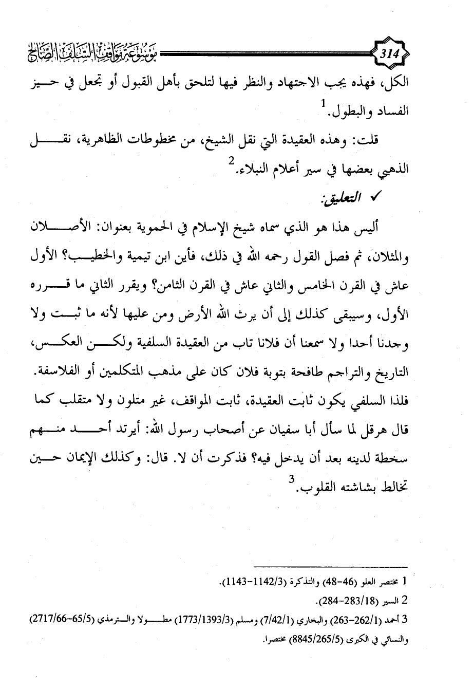 أليس هذا هو الذي سماه شيخ الإسلام في الحموية بعنوان: الأصلان والمثلان، ثم فصل القول رحمه الله في ذلك، فأين ابن تيمية والخطيب؟ الأول عاش في القرن الخامس والثاني عاش في القرن الثامن؟ ويقرر الثاني ما قرره الأول، وسيبقى كذلك إلى أن يرث الله الأرض ومن عليها لأنه ما ثبت ولا وجدنا أحدا ولا سمعنا أن فلانا تاب من العقيدة السلفية ولكن العكس، التاريخ والتراجم طافحة بتوبة فلان كان على مذهب المتكلمين أو الفلاسفة. فلذا السلفي يكون ثابت العقيدة، ثابت المواقف، غير متلون ولا متقلب كما قال هرقل لما سأل أبا سفيان عن أصحاب رسول الله: أيرتد أحد منهم سخطة لدينه بعد أن يدخل فيه؟ فذكرت أن لا. قال: وكذلك الإيمان حين تخالط بشاشته القلوب. (¬3)