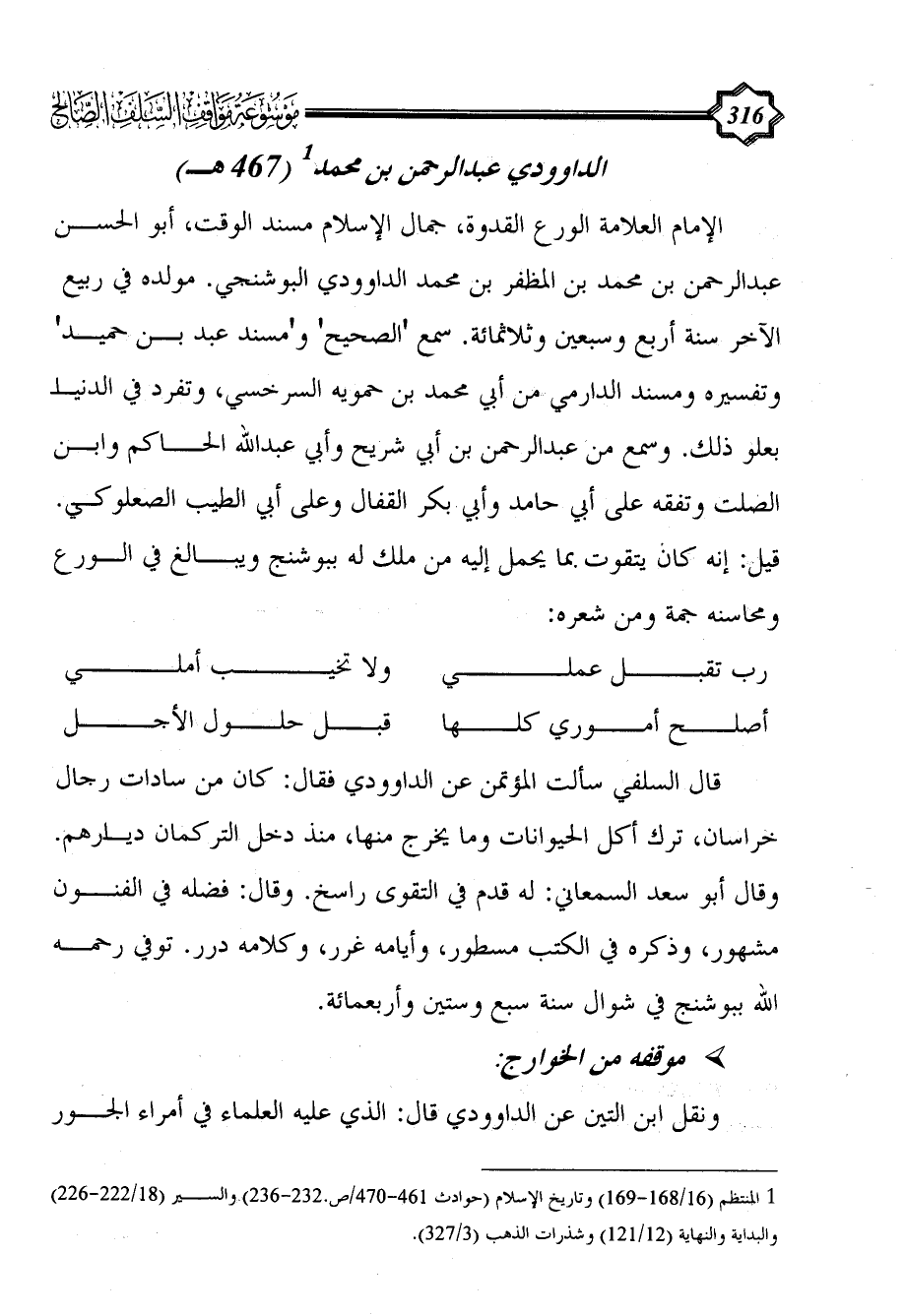 الإمام العلامة الورع القدوة، جمال الإسلام مسند الوقت، أبو الحسن عبد الرحمن بن محمد بن المظفر بن محمد الداوودي البوشنجي. مولده في ربيع الآخر سنة أربع وسبعين وثلاثمائة. سمع 'الصحيح' و'مسند عبد بن حميد' وتفسيره ومسند الدارمي من أبي محمد بن حمويه السرخسي، وتفرد في الدنيا بعلو ذلك. وسمع من عبد الرحمن بن أبي شريح وأبي عبد الله الحاكم وابن الصلت وتفقه على أبي حامد وأبي بكر القفال وعلى أبي الطيب الصعلوكي. قيل: إنه كان يتقوت بما يحمل إليه من ملك له ببوشنج ويبالغ في الورع ومحاسنه جمة ومن شعره: