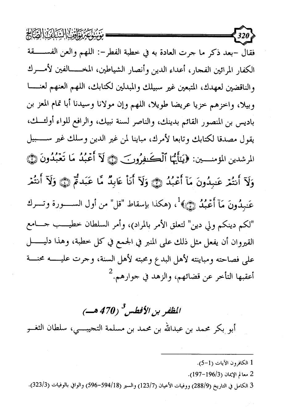 فقال -بعد ذكر ما جرت العادة به في خطبة الفطر-: اللهم والعن الفسقة الكفار المرائين الفجار، أعداء الدين وأنصار الشياطين، المخالفين لأمرك والناقضين لعهدك، المتبعين غير سبيلك والمبدلين لكتابك، اللهم العنهم لعنا وبيلا، واخزهم خزيا عريضا طويلا، اللهم وإن مولانا وسيدنا أبا تمام المعز بن باديس بن المنصور القائم بدينك، والناصر لسنة نبيك، والرافع للواء أولئك، يقول مصدقا لكتابك وتابعا لأمرك، مباينا لمن غير الدين وسلك غير سبيل المرشدين المؤمنين: {يَا أَيُّهَا الْكَافِرُونَ (1) لَا أَعْبُدُ مَا تَعْبُدُونَ (2) وَلَا أَنْتُمْ عَابِدُونَ مَا أَعْبُدُ (3) وَلَا أَنَا عَابِدٌ مَا عَبَدْتُمْ (4) وَلَا أَنْتُمْ عَابِدُونَ مَا أَعْبُدُ (5)} (¬1)، (هكذا بإسقاط "قل" من أول السورة وترك "لكم دينكم ولي دين" لتعلق الأمر بالمراد)، وأمر السلطان خطيب جامع القيروان أن يفعل مثل ذلك على المنبر في الجمع في كل خطبة، وهذا دليل على فصاحته ومباينته لأهل البدع ومحبته لأهل السنة، وجرت عليه محنة أعقبها التأخر عن قضائهم، والزهد في جوارهم. (¬2)