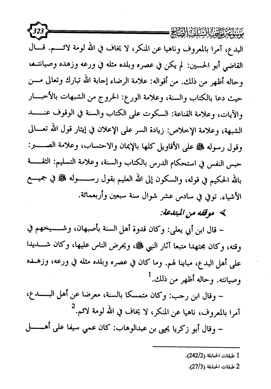 - وقال ابن رجب: وكان متمسكا بالسنة، معرضا عن أهل البدع، آمرا بالمعروف، ناهيا عن المنكر، لا يخاف في الله لومة لائم. (¬2)