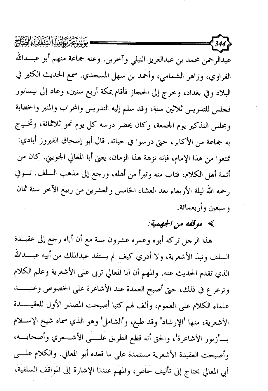 هذا الرجل تركه أبوه وعمره عشرون سنة مع أن أباه رجع إلى عقيدة السلف ونبذ الأشعرية، ولا أدري كيف لم يستفد عبد الملك من أبيه عبد الله الذي تقدم الحديث عنه. والمهم أن أبا المعالي تربى على الأشعرية وعلم الكلام وترعرع في ذلك، حتى أصبح العمدة عند الأشاعرة على الخصوص وعند علماء الكلام على العموم، وألف لهم كتبا أصبحت المصدر الأول للعقيدة الأشعرية، منها 'الإرشاد' وقد طبع، و'الشامل' وهو الذي سماه شيخ الإسلام بـ'زبور الأشاعرة'، والحق أنه قطع الطريق على الأشعري وأصحابه، وأصبحت العقيدة الأشعرية مستمدة على ما قعده أبو المعالي. والكلام على أبي المعالي يحتاج إلى تأليف خاص، والمهم عندنا الإشارة إلى المواقف السلفية،