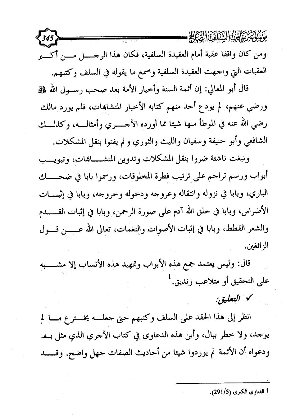 قال أبو المعالي: إن أئمة السنة وأخيار الأمة بعد صحب رسول الله - صلى الله عليه وسلم - ورضي عنهم، لم يودع أحد منهم كتابه الأخبار المتشابهات، فلم يورد مالك رضي الله عنه في الموطأ منها شيئا مما أورده الآجري وأمثاله، وكذلك الشافعي وأبو حنيفة وسفيان والليث والثوري ولم يفتوا بنقل المشكلات.