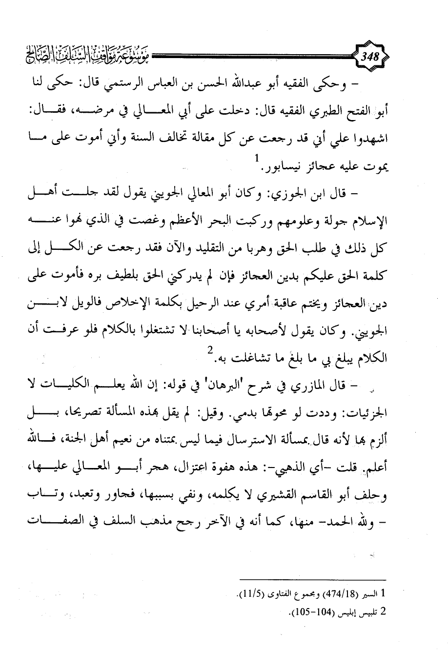 - وحكى الفقيه أبو عبد الله الحسن بن العباس الرستمي قال: حكى لنا أبو الفتح الطبري الفقيه قال: دخلت على أبي المعالي في مرضه، فقال: اشهدوا علي أني قد رجعت عن كل مقالة تخالف السنة وأني أموت على ما يموت عليه عجائز نيسابور. (¬1)