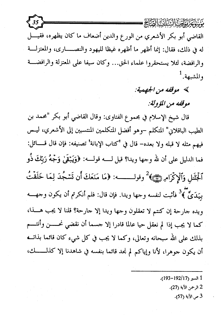 قال شيخ الإسلام في مجموع الفتاوى: وقال القاضي أبو بكر "محمد بن الطيب الباقلاني" المتكلم -وهو أفضل المتكلمين المنتسبين إلى الأشعري، ليس فيهم مثله لا قبله ولا بعده- قال في 'كتاب الإبانة' تصنيفه: فإن قال قائل: فما الدليل على أن لله وجها ويدا؟ قيل له قوله: {وَيَبْقَى وَجْهُ رَبِّكَ ذُو الْجَلَالِ وَالْإِكْرَامِ (27)} (¬2) وقوله: {مَا مَنَعَكَ أَنْ تَسْجُدَ لِمَا خَلَقْتُ بِيَدَيَّ} (¬3) فأثبت لنفسه وجها ويدا. فإن قال: فلم أنكرتم أن يكون وجهه ويده جارحة إن كنتم لا تعقلون وجها ويدا إلا جارحة؟ قلنا لا يجب هذا، كما لا يجب إذا لم نعقل حيا عالما قادرا إلا جسما أن نقضي نحن وأنتم بذلك على الله سبحانه وتعالى، وكما لا يجب في كل شيء كان قائما بذاته أن يكون جوهرا، لأنا وإياكم لم نجد قائما بنفسه في شاهدنا إلا كذلك،