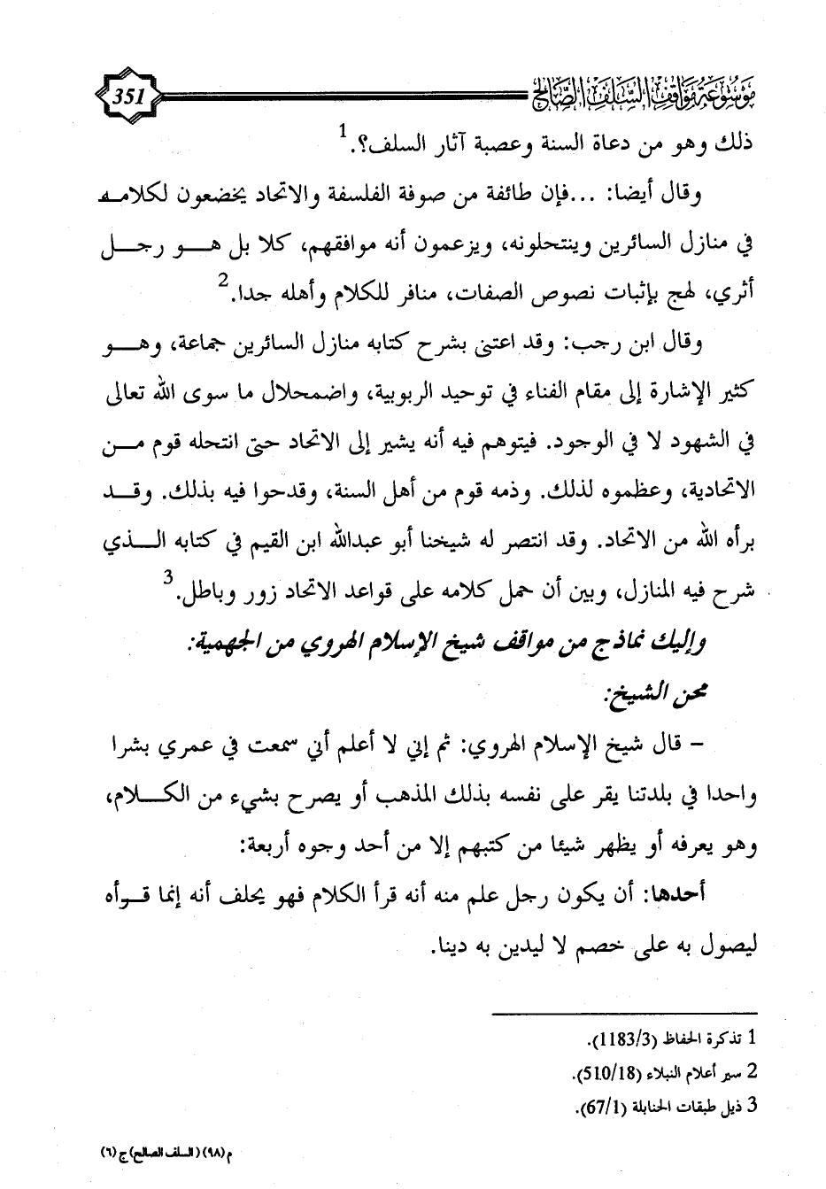 وقال أيضاً: ... فإن طائفة من صوفة الفلسفة والاتحاد يخضعون لكلامه في منازل السائرين وينتحلونه، ويزعمون أنه موافقهم، كلا بل هو رجل أثري، لهج بإثبات نصوص الصفات، منافر للكلام وأهله جداً. (¬2)