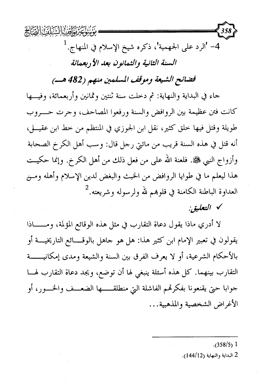 لا أدري ماذا يقول دعاة التقارب في مثل هذه الوقائع المؤلمة، وماذا يقولون في تعبير الإمام ابن كثير هذا: هل هو جاهل بالوقائع التاريخية أو بالأحكام الشرعية، أو لا يعرف الفرق بين السنة والشيعة ومدى إمكانية التقارب بينهما. كل هذه أسئلة ينبغي لها أن توضع، ويجد دعاة التقارب لها جوابا حتى يقنعونا بفكرتهم الفاشلة التي منطلقها الضعف والخور، أو الأغراض الشخصية والمذهبية ...