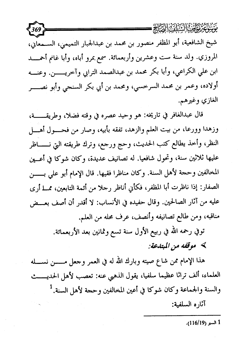 شيخ الشافعية، أبو المظفر منصور بن محمد بن عبد الجبار التميمي، السمعاني، المروزي. ولد سنة ست وعشرين وأربعمائة. سمع بمرو أباه، وأبا غانم أحمد ابن علي الكراعي، وأبا بكر محمد بن عبد الصمد الترابي وآخرين. وعنه أولاده، وعمر بن محمد السرخسي، ومحمد بن أبي بكر السنجي وأبو نصر الغازي وغيرهم.