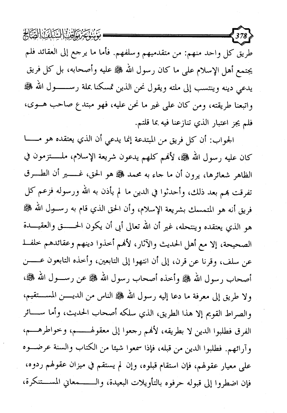 الجواب: أن كل فريق من المبتدعة إنما يدعي أن الذي يعتقده هو ما كان عليه رسول الله - صلى الله عليه وسلم -، لأنهم كلهم يدعون شريعة الإسلام، ملتزمون في الظاهر شعائرها، يرون أن ما جاء به محمد - صلى الله عليه وسلم - هو الحق، غير أن الطرق تفرقت بهم بعد ذلك، وأحدثوا في الدين ما لم يأذن به الله ورسوله فزعم كل فريق أنه هو المتمسك بشريعة الإسلام، وأن الحق الذي قام به رسول الله - صلى الله عليه وسلم - هو الذي يعتقده وينتحله، غير أن الله تعالى أبى أن يكون الحق والعقيدة الصحيحة، إلا مع أهل الحديث والآثار، لأنهم أخذوا دينهم وعقائدهم خلفا عن سلف، وقرنا عن قرن، إلى أن انتهوا إلى التابعين، وأخذه التابعون عن أصحاب رسول الله - صلى الله عليه وسلم - وأخذه أصحاب رسول الله - صلى الله عليه وسلم - عن رسول الله - صلى الله عليه وسلم -، ولا طريق إلى معرفة ما دعا إليه رسول الله - صلى الله عليه وسلم - الناس من الدين المستقيم، والصراط القويم إلا هذا الطريق، الذي سلكه أصحاب الحديث، وأما سائر الفرق فطلبوا الدين لا بطريقه، لأنهم رجعوا إلى معقولهم، وخواطرهم، وآرائهم. فطلبوا الدين من قبله، فإذا سمعوا شيئا من الكتاب والسنة عرضوه على معيار عقولهم، فإن استقام قبلوه، وإن لم يستقم في ميزان عقولهم ردوه، فإن اضطروا إلى قبوله حرفوه بالتأويلات البعيدة، والمعاني المستنكرة،