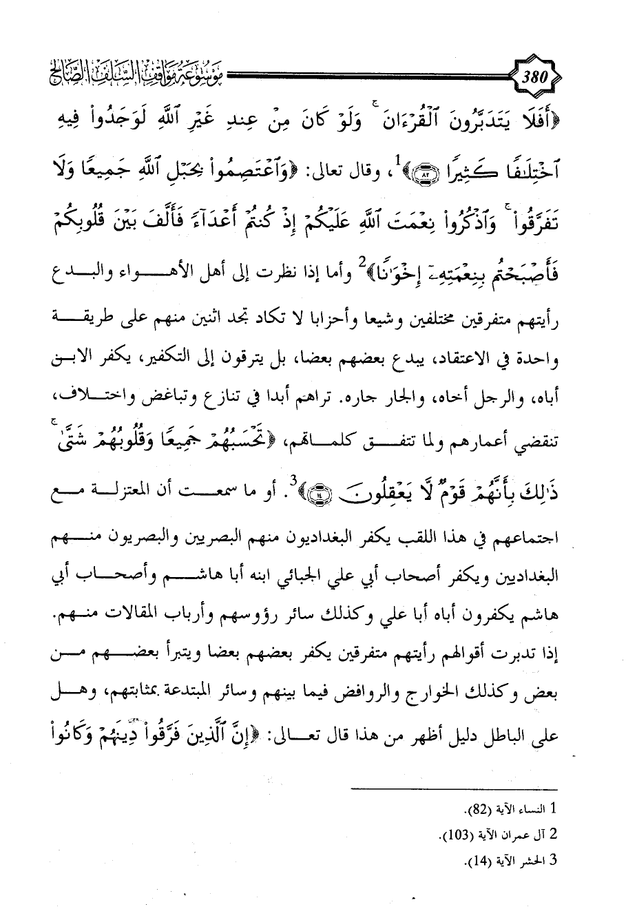 وأما إذا نظرت إلى أهل الأهواء والبدع رأيتهم متفرقين مختلفين وشيعا وأحزابا لا تكاد تجد اثنين منهم على طريقة واحدة في الاعتقاد، يبدع بعضهم بعضا، بل يترقون إلى التكفير، يكفر الابن أباه، والرجل أخاه، والجار جاره. تراهم أبدا في تنازع وتباغض واختلاف، تنقضي أعمارهم ولما تتفق كلماتهم، {تَحْسَبُهُمْ جَمِيعًا وَقُلُوبُهُمْ شَتَّى ذَلِكَ بِأَنَّهُمْ قَوْمٌ لَا يَعْقِلُونَ (14)} (¬3). أو ما سمعت أن المعتزلة مع اجتماعهم في هذا اللقب يكفر البغداديون منهم البصريين والبصريون منهم البغداديين ويكفر أصحاب أبي علي الجبائي ابنه أبا هاشم وأصحاب أبي هاشم يكفرون أباه أبا علي وكذلك سائر رؤوسهم وأرباب المقالات منهم. إذا تدبرت أقوالهم رأيتهم متفرقين يكفر بعضهم بعضا ويتبرأ بعضهم من بعض وكذلك الخوارج والروافض فيما بينهم وسائر المبتدعة بمثابتهم، وهل على الباطل دليل أظهر من هذا قال تعالى: {إِنَّ الَّذِينَ فَرَّقُوا دِينَهُمْ وَكَانُوا