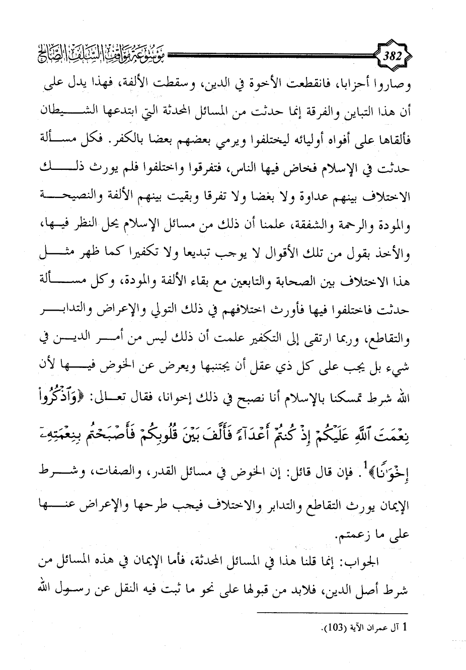 وصاروا أحزابا، فانقطعت الأخوة في الدين، وسقطت الألفة، فهذا يدل على أن هذا التباين والفرقة إنما حدثت من المسائل المحدثة التي ابتدعها الشيطان فألقاها على أفواه أوليائه ليختلفوا ويرمي بعضهم بعضا بالكفر. فكل مسألة حدثت في الإسلام فخاض فيها الناس، فتفرقوا واختلفوا فلم يورث ذلك الاختلاف بينهم عداوة ولا بغضا ولا تفرقا وبقيت بينهم الألفة والنصيحة والمودة والرحمة والشفقة، علمنا أن ذلك من مسائل الإسلام يحل النظر فيها، والأخذ بقول من تلك الأقوال لا يوجب تبديعا ولا تكفيرا كما ظهر مثل هذا الاختلاف بين الصحابة والتابعين مع بقاء الألفة والمودة، وكل مسألة حدثت فاختلفوا فيها فأورث اختلافهم في ذلك التولي والإعراض والتدابر والتقاطع، وربما ارتقى إلى التكفير علمت أن ذلك ليس من أمر الدين في شيء بل يجب على كل ذي عقل أن يجتنبها ويعرض عن الخوض فيها لأن الله شرط تمسكنا بالإسلام أنا نصبح في ذلك إخوانا، فقال تعالى: {وَاذْكُرُوا نِعْمَةَ اللَّهِ عَلَيْكُمْ إِذْ كُنْتُمْ أَعْدَاءً فَأَلَّفَ بَيْنَ قُلُوبِكُمْ فَأَصْبَحْتُمْ بِنِعْمَتِهِ إِخْوَانًا} (¬1).