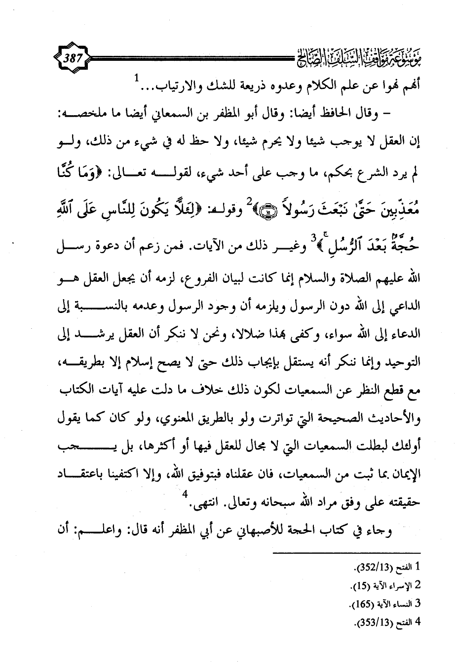- وقال الحافظ أيضا: وقال أبو المظفر بن السمعاني أيضا ما ملخصه: إن العقل لا يوجب شيئا ولا يحرم شيئا، ولا حظ له في شيء من ذلك، ولو لم يرد الشرع بحكم، ما وجب على أحد شيء، لقوله تعالى: {وَمَا كُنَّا مُعَذِّبِينَ حَتَّى نَبْعَثَ رَسُولًا (15)} (¬2) وقوله: {لئلا يَكُونَ لِلنَّاسِ عَلَى اللَّهِ حُجَّةٌ بَعْدَ الرُّسُلِ} (¬3) وغير ذلك من الآيات. فمن زعم أن دعوة رسل الله عليهم الصلاة والسلام إنما كانت لبيان الفروع، لزمه أن يجعل العقل هو الداعي إلى الله دون الرسول ويلزمه أن وجود الرسول وعدمه بالنسبة إلى الدعاء إلى الله سواء، وكفى بهذا ضلالا، ونحن لا ننكر أن العقل يرشد إلى التوحيد وإنما ننكر أنه يستقل بإيجاب ذلك حتى لا يصح إسلام إلا بطريقه، مع قطع النظر عن السمعيات لكون ذلك خلاف ما دلت عليه آيات الكتاب والأحاديث الصحيحة التي تواترت ولو بالطريق المعنوي، ولو كان كما يقول أولئك لبطلت السمعيات التي لا مجال للعقل فيها أو أكثرها، بل يجب الإيمان بما ثبت من السمعيات، فان عقلناه فبتوفيق الله، وإلا اكتفينا باعتقاد حقيقته على وفق مراد الله سبحانه وتعالى. انتهى. (¬4)
