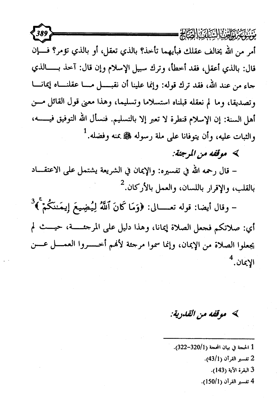 - وقال أيضا: قوله تعالى: {وَمَا كَانَ اللَّهُ لِيُضِيعَ إِيمَانَكُمْ} (¬3) أي: صلاتكم فجعل الصلاة إيمانا، وهذا دليل على المرجئة، حيث لم يجعلوا الصلاة من الإيمان، وإنما سموا مرجئة لأنهم أخروا العمل عن الإيمان. (¬4)